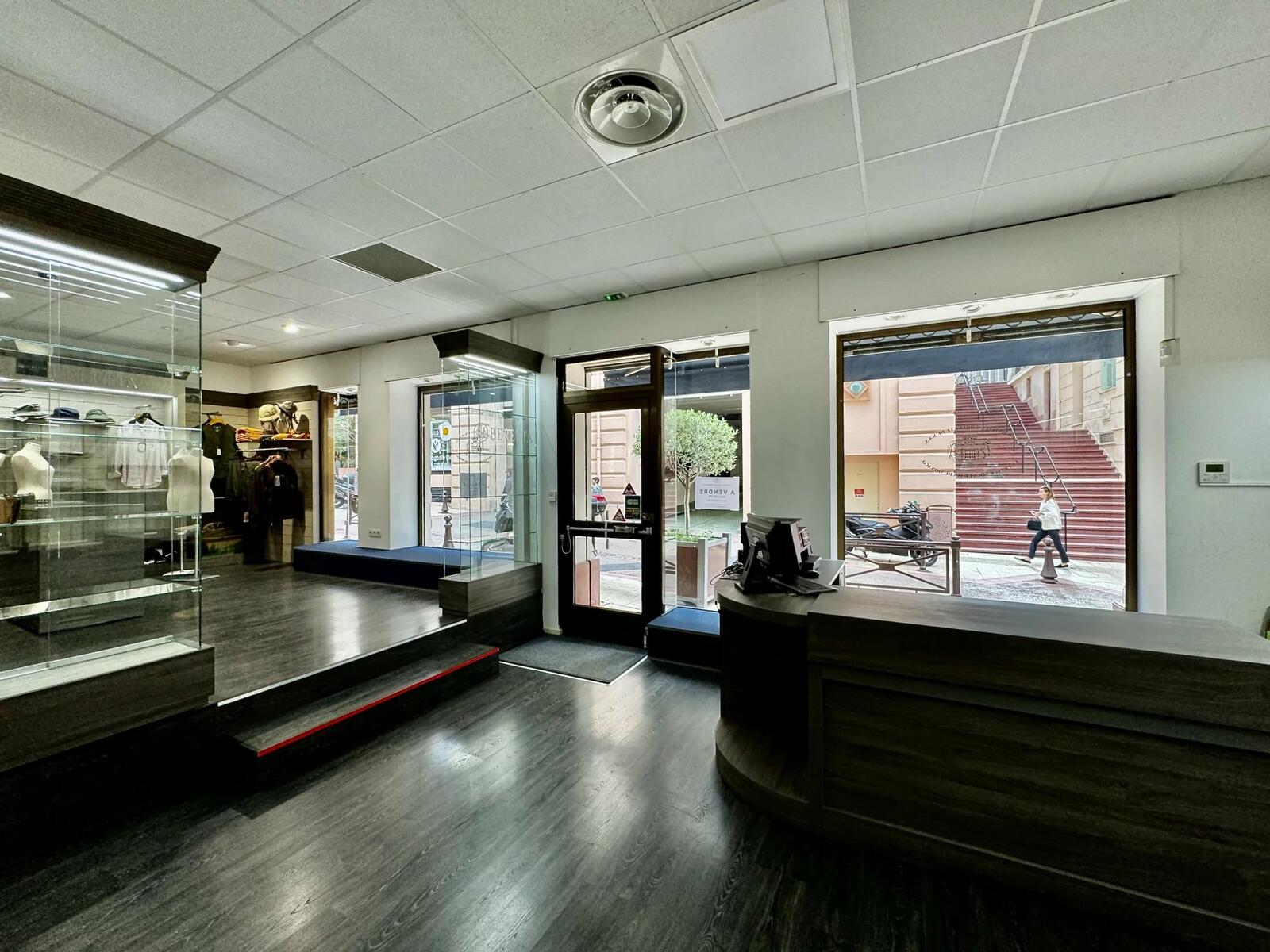 With a surface area of 150m2 on the first floor, this premises benefits from optimal exposure thanks to its four 1.90m-wide shop windows, each offering a good view of Rue Terrazzani. It also boasts a spacious, healthy basement storage cellar of approx. 17m2.