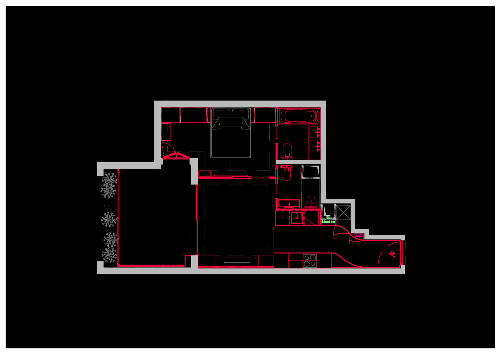 Large renovated 2-room apartment, consisting of an entrance, living room, equipped kitchen, bedroom, bathroom, guest toilet.