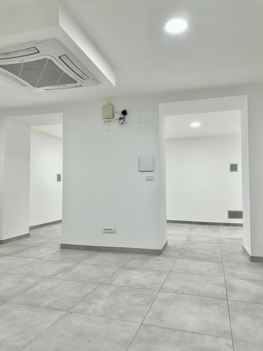 On the ground floor, the space features an open-plan office, a small kitchen, two separate toilets for men and women, and two separate offices. In the basement: a spacious open area and a closed office.