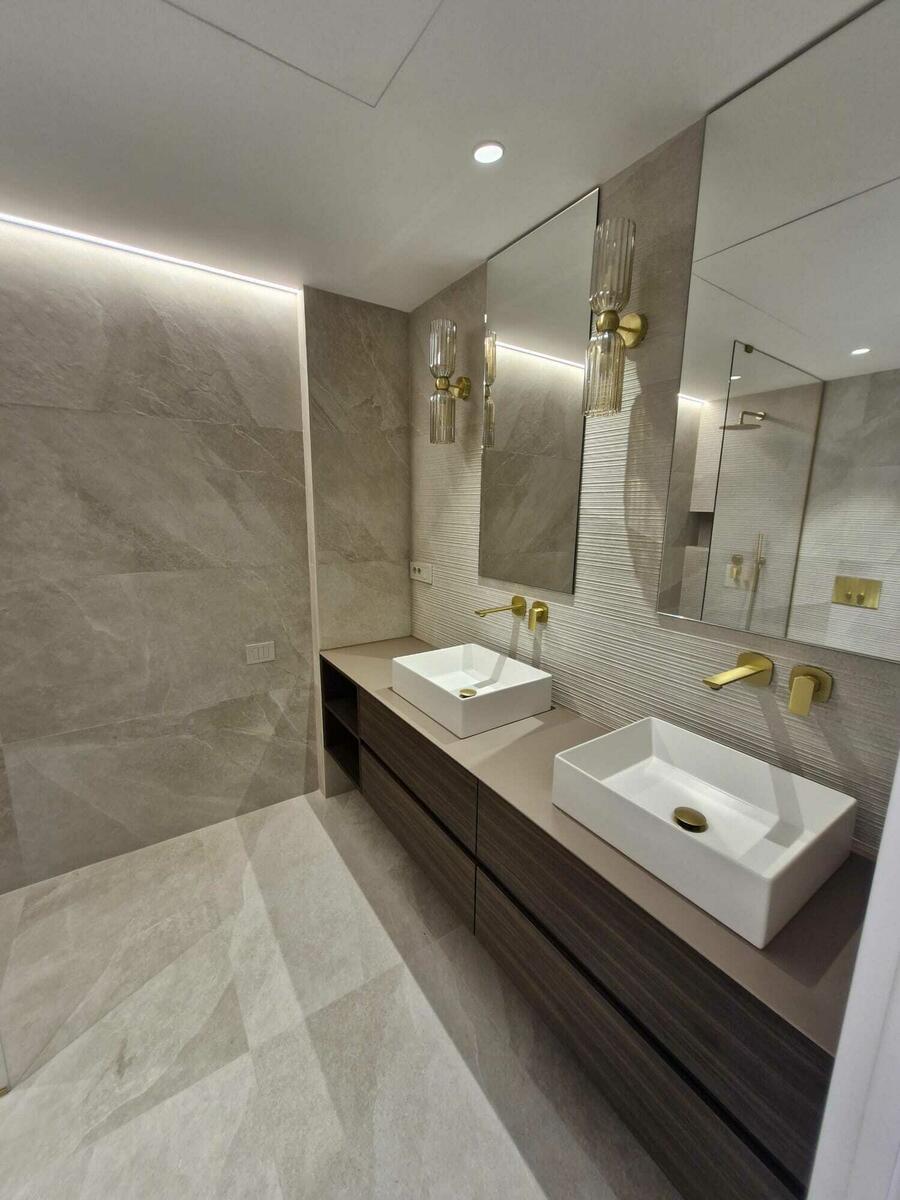 The apartment, very bright, consists of a large entrance hall extending into the living room, 2 bedrooms with their respective shower rooms, one of which has a dressing area and an office corner, an independent kitchen fully fitted and equipped including a laundry area and a guest toilet.