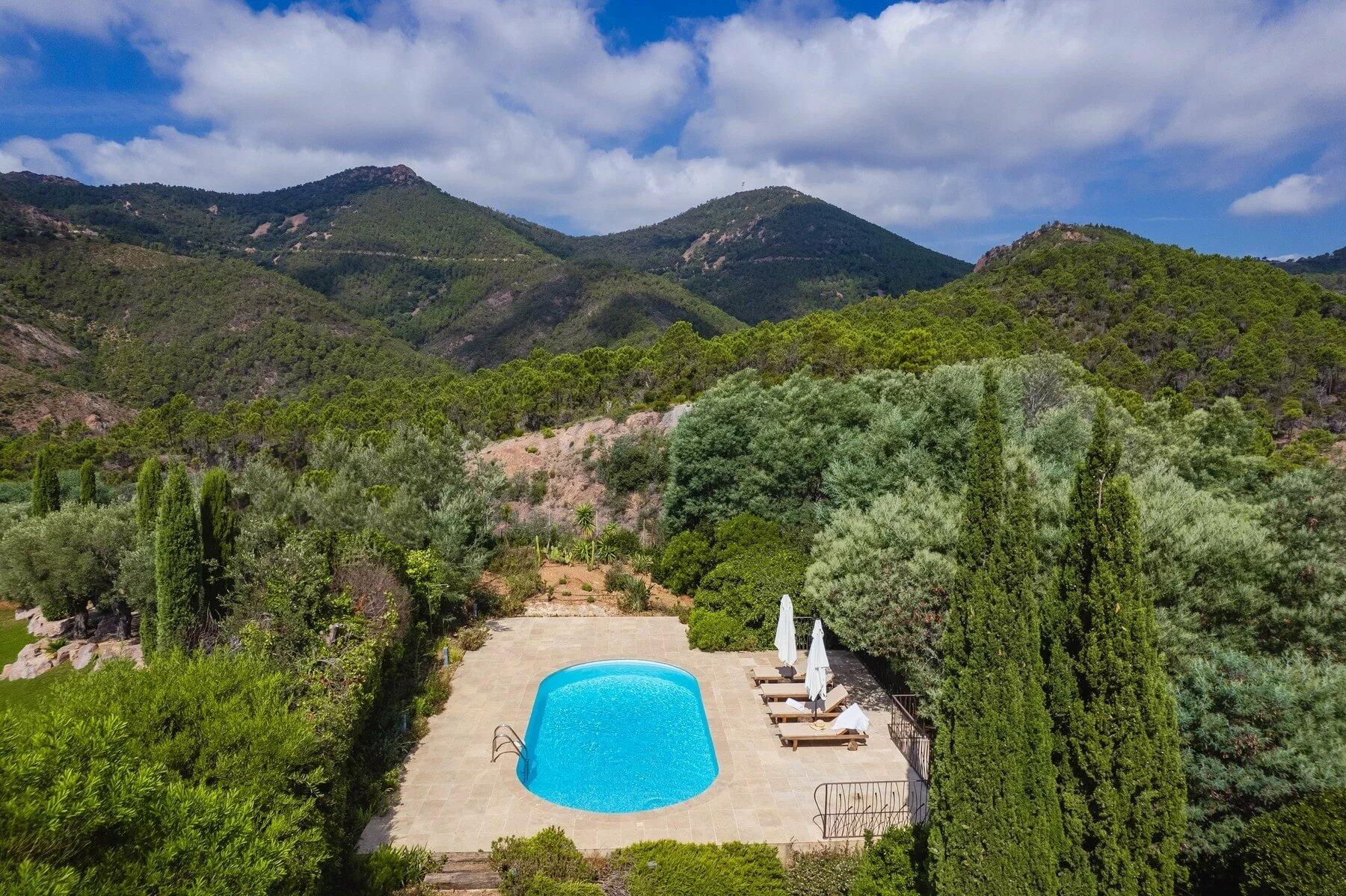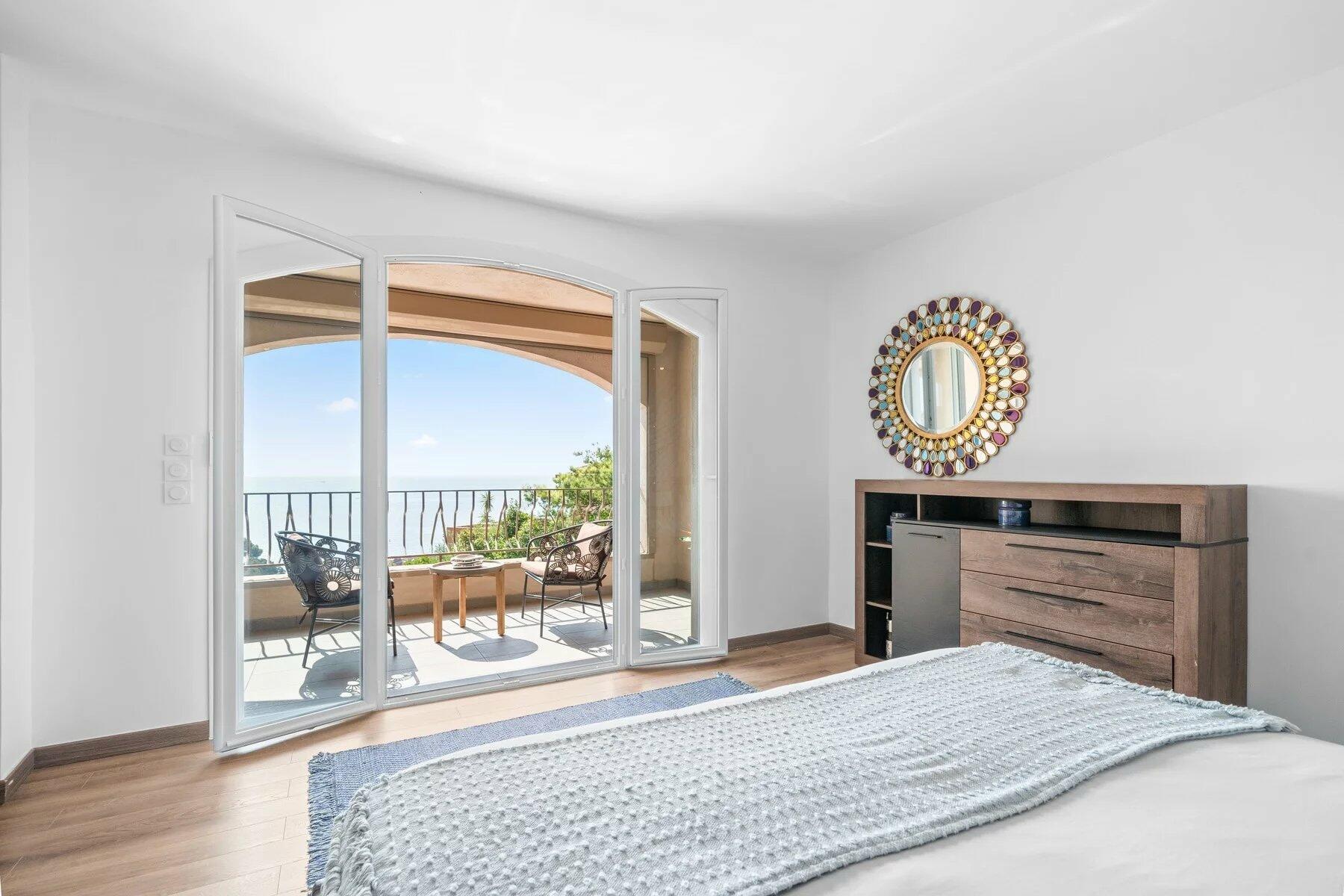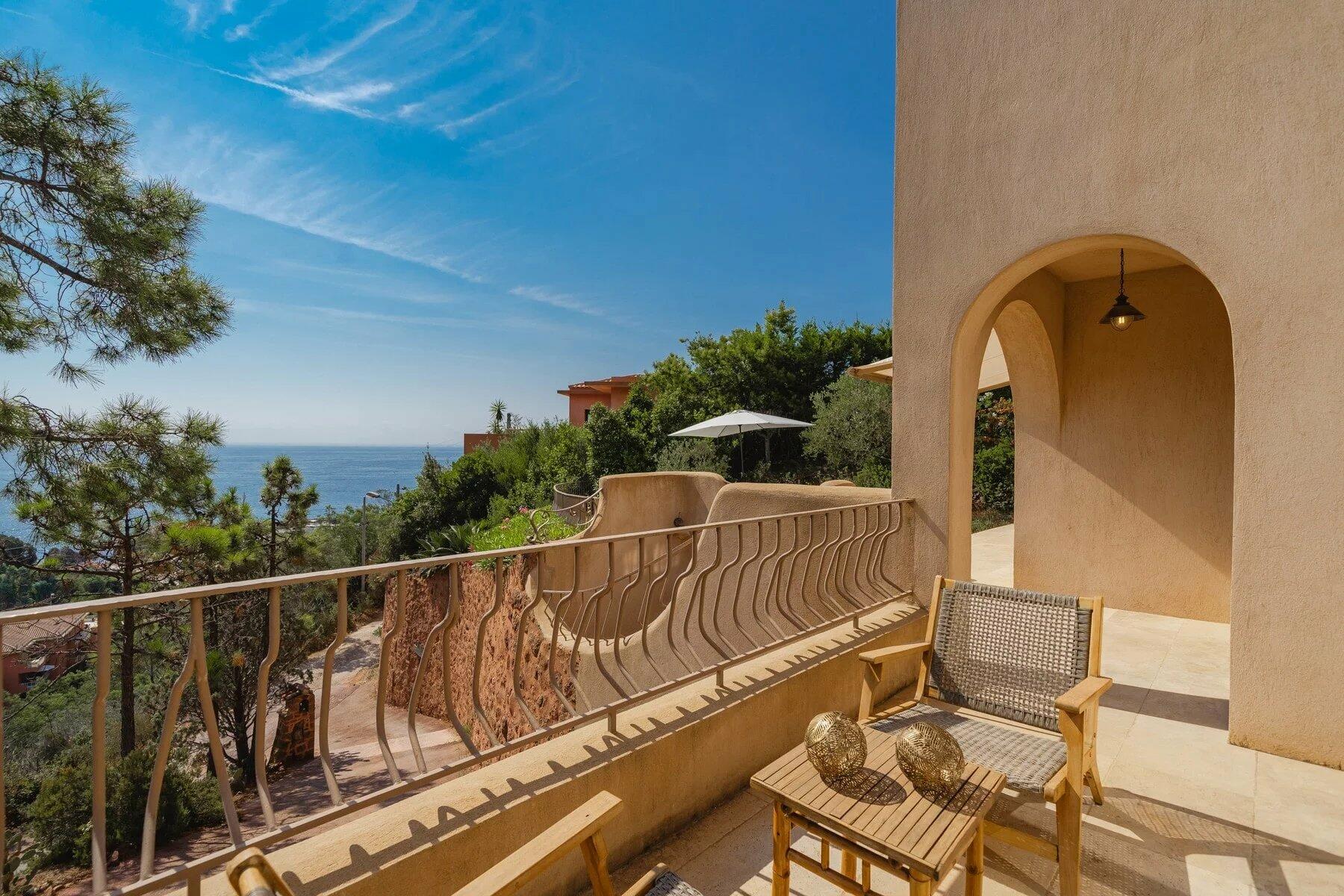 On the upper floor, a spacious bedroom with an ensuite shower and dressing room extends onto a loggia, offering views of the sea and the Miramar neighborhood. At the top of the property, a large terrace with a pool enjoys full sun exposure and stunning views of the sea and the Esterel hills. A garage completes the property and can accommodate a car and several scooters.
