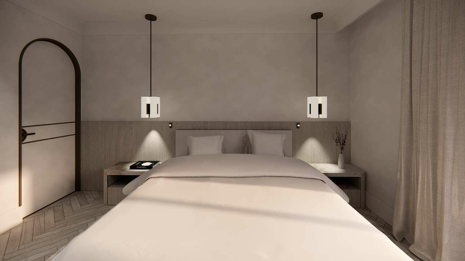On the upper level, a private rooftop terrace offers a shaded outdoor lounge under a pergola and a jacuzzi, creating an exclusive relaxation space with breathtaking city views.
