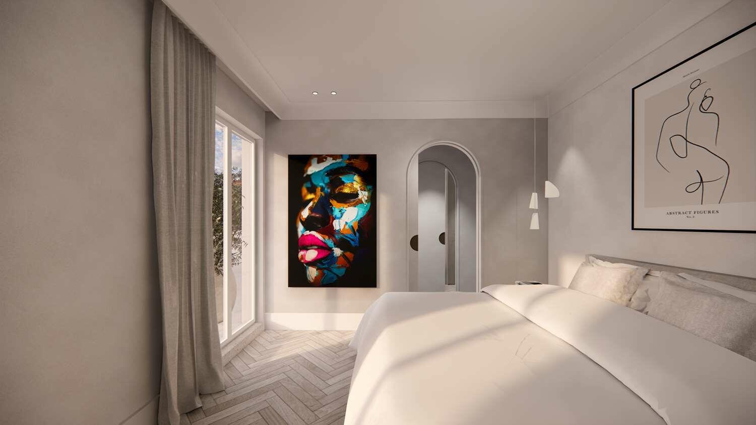 The night area includes a master bedroom with a dressing room, a bathroom with a bathtub and shower. Two additional bedrooms feature ample storage and their own shower rooms, all opening onto a large private terrace.