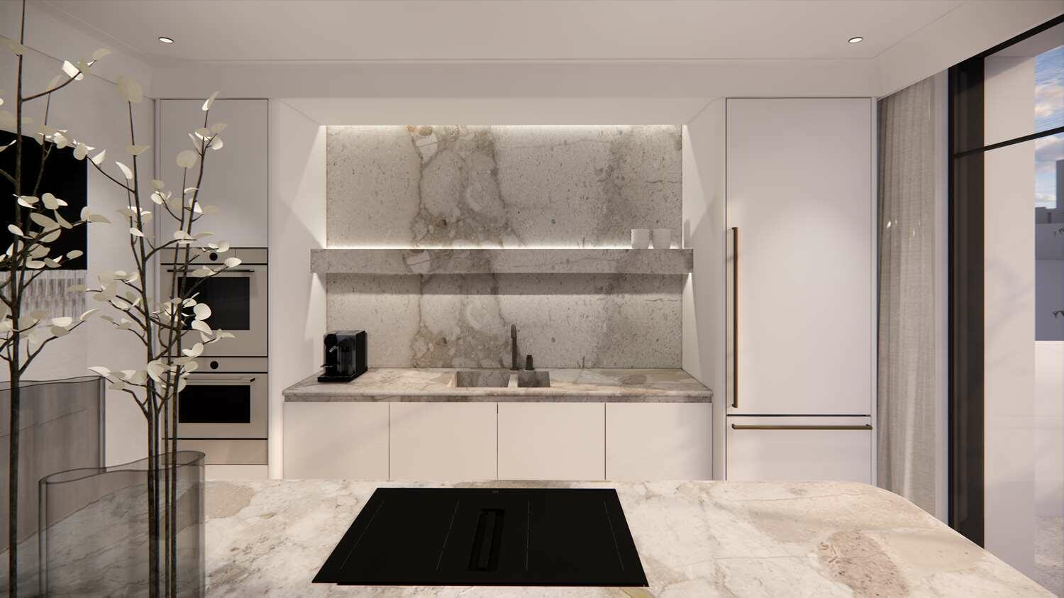 The entrance leads to a spacious living area, comprising a lounge and dining room, with an open-plan kitchen. A terrace runs along the entire living space, enhancing brightness.K
