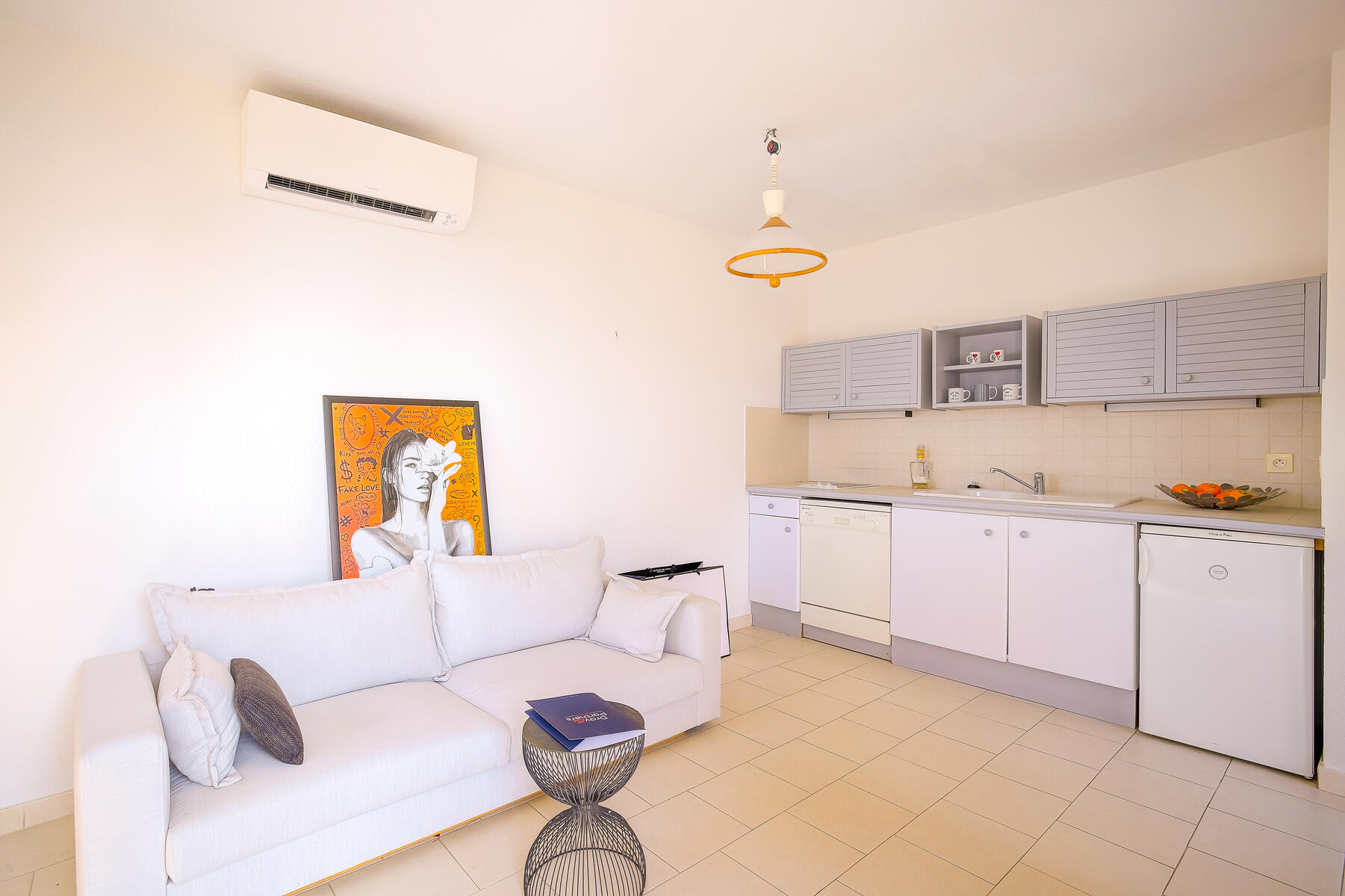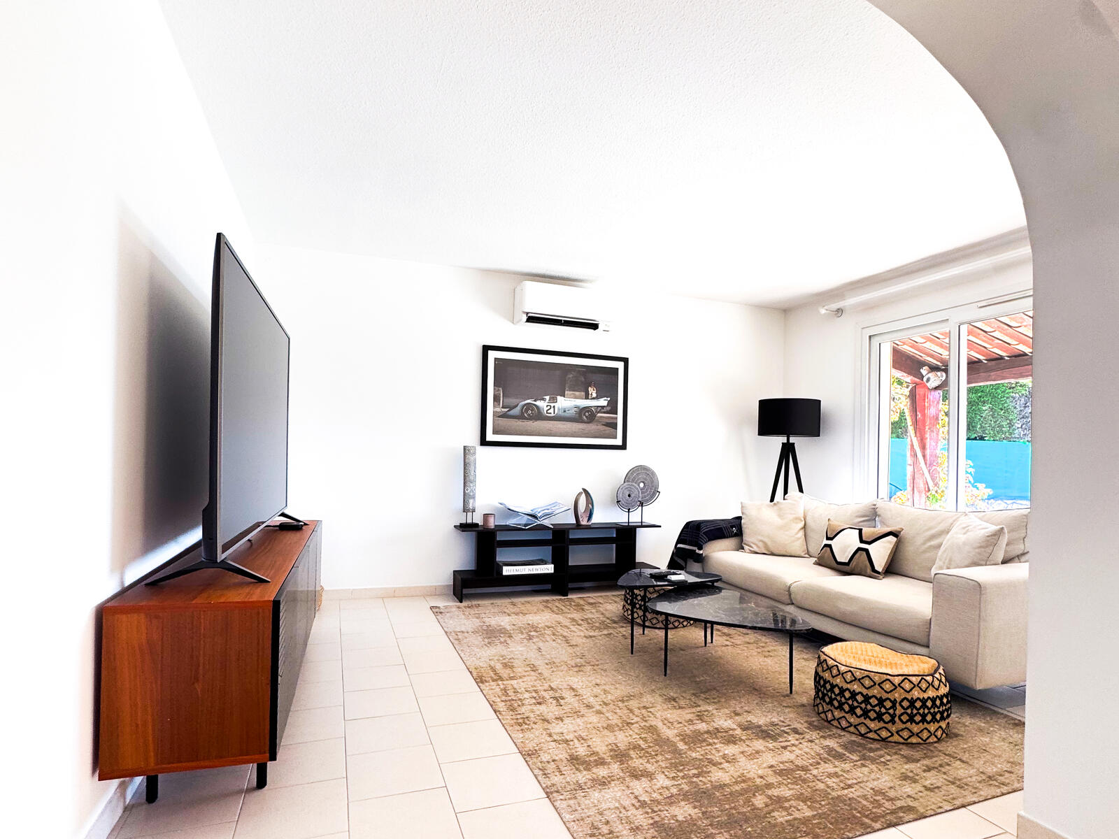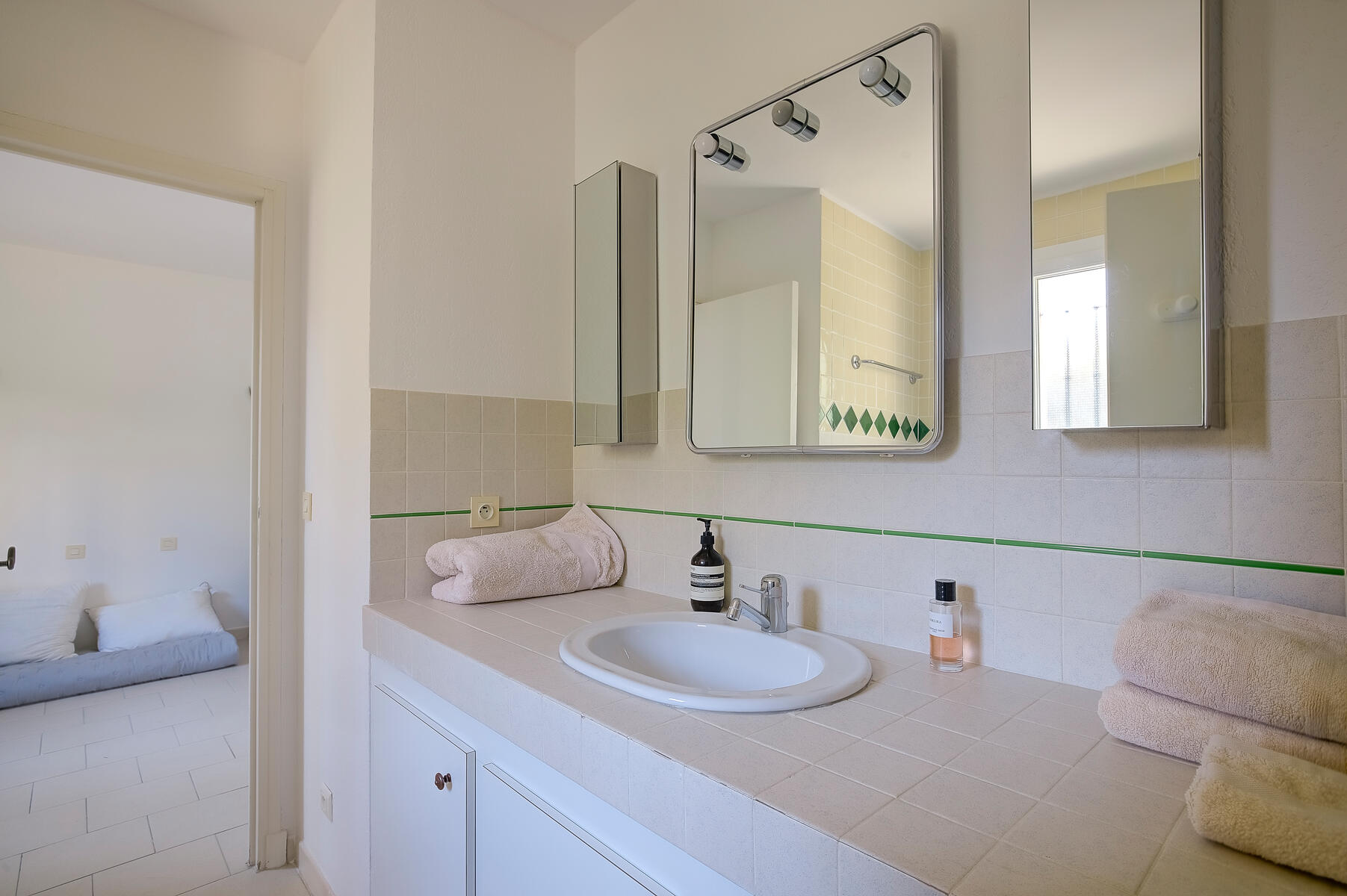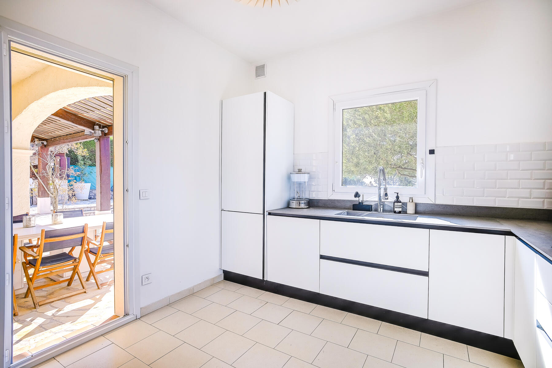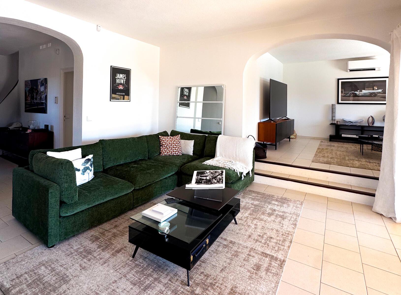 This bright and comfortable villa features a vast living area of over 60 m², including a TV lounge, a living room, and a fully new, equipped, and functional open kitchen. Thanks to its multiple exposures, you can enjoy the sun throughout the day. The kitchen opens onto a delightful outdoor space, where a beautiful travertine table can accommodate up to 14 guests for al fresco dining.