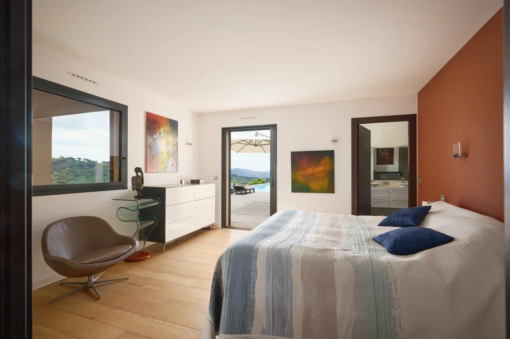 In absolute calm, this elegant contemporary villa with high-end features offers spacious and light-filled living areas, including a glass-walled living room with panoramic views opening onto the stunning infinity pool overlooking the sea, a more intimate lounge with fireplace, a fully equipped kitchen with pantry.