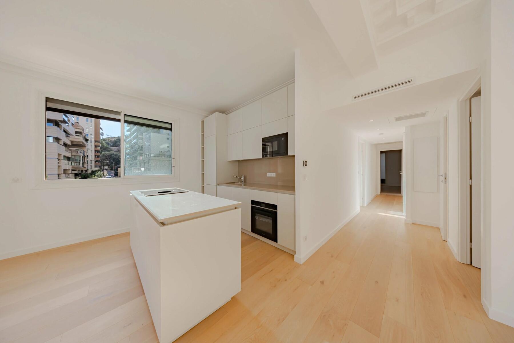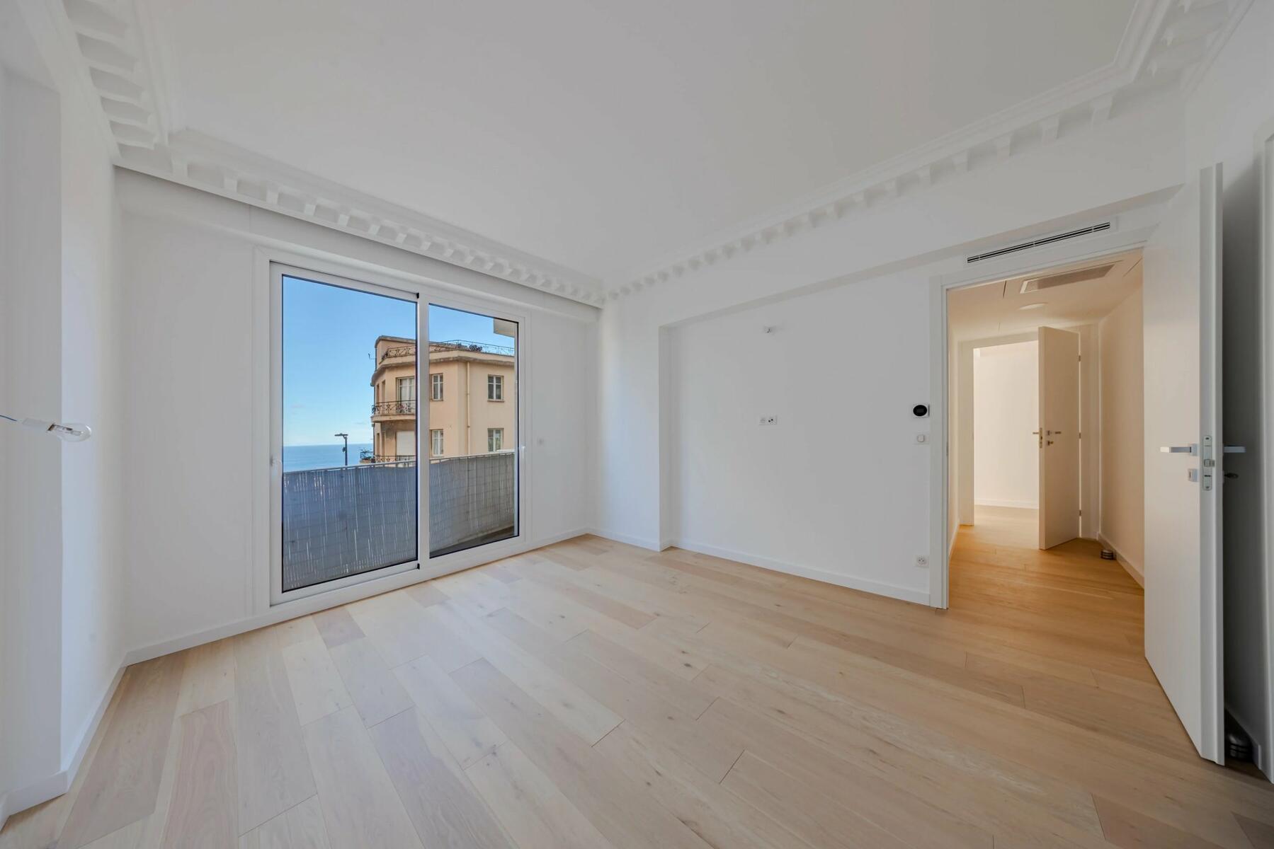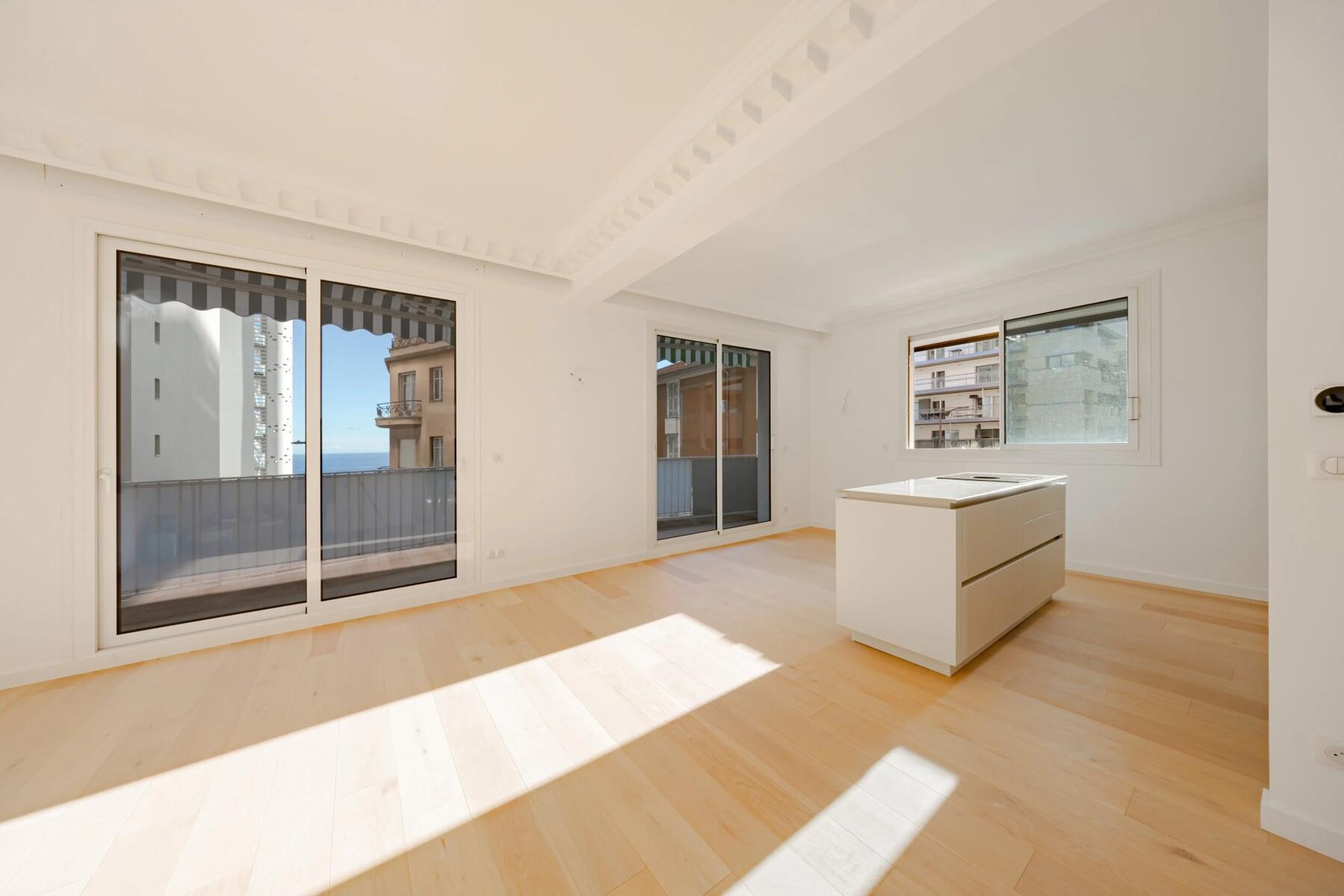 The bright apartment is located on the first floor with an elevator and offers a beautiful view of the sea and the Rock. This 4-room apartment with high ceilings consists of a double living room with an open kitchen opening onto a terrace, two bedrooms with en-suite bathrooms, a guest toilet, and a third bedroom with its own bathroom. The property also features an outdoor space with a pergola.
