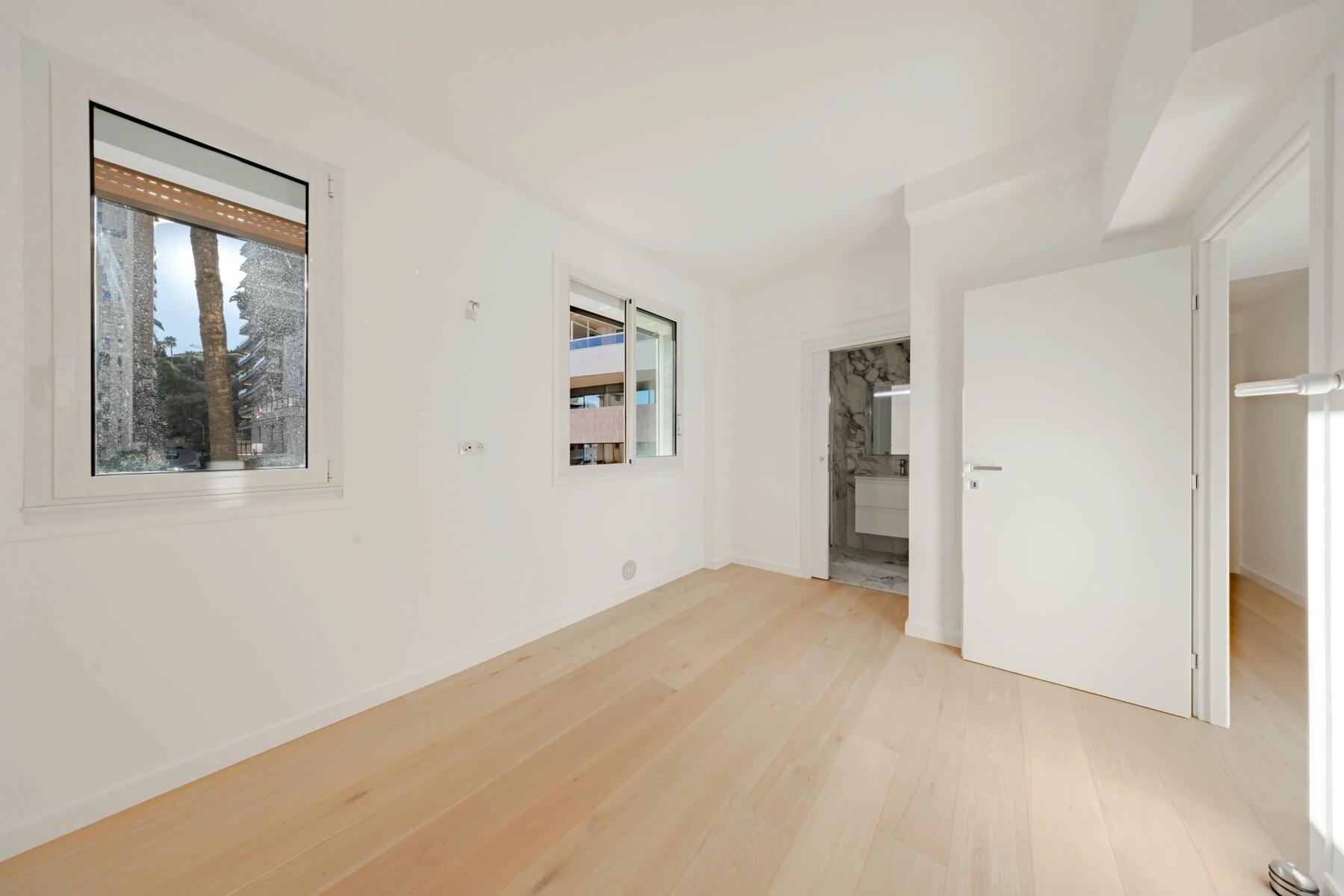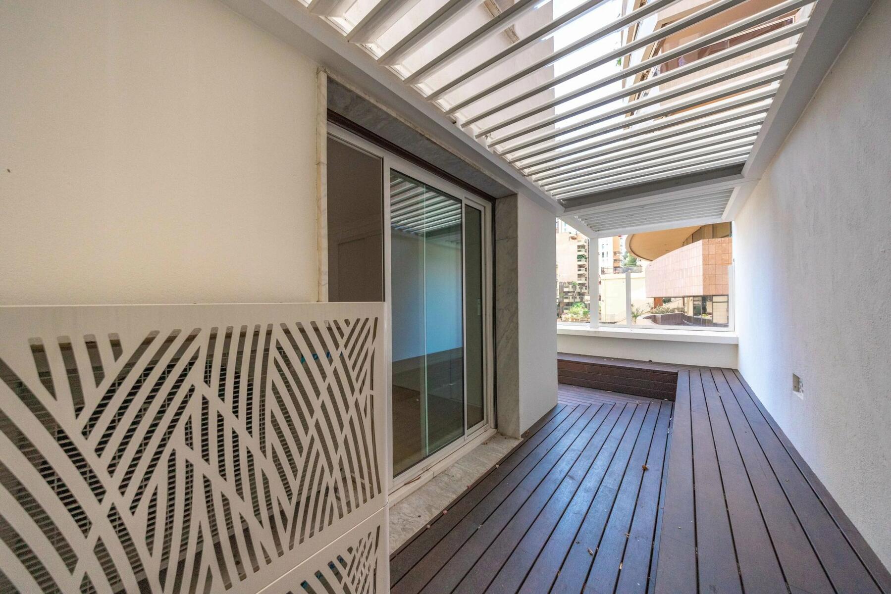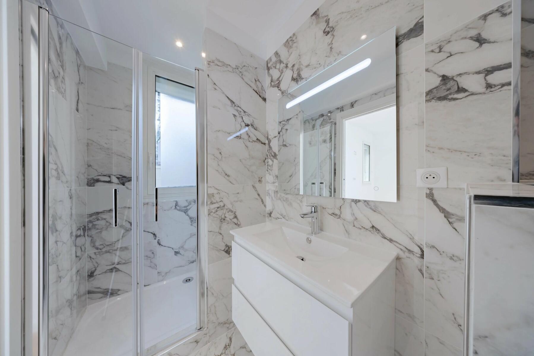 The bright apartment is located on the first floor with an elevator and offers a beautiful view of the sea and the Rock. This 4-room apartment with high ceilings consists of a double living room with an open kitchen opening onto a terrace, two bedrooms with en-suite bathrooms, a guest toilet, and a third bedroom with its own bathroom. The property also features an outdoor space with a pergola.
