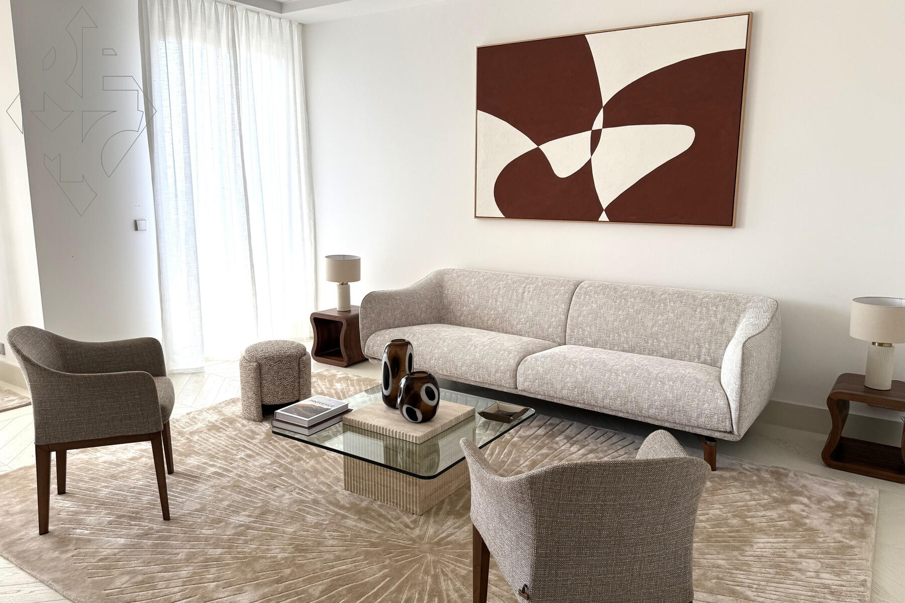A bright and spacious living room, extended by a loggia and enhanced by a bay window with unobstructed sea views,