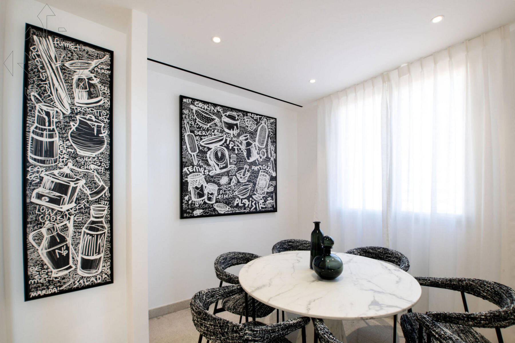 An elegant entrance hall, a spacious living room bathed in natural light opening onto a terrace and balcony—perfect for entertaining or relaxing. A fully equipped independent kitchen with a dining area elegantly integrated into a bay window.