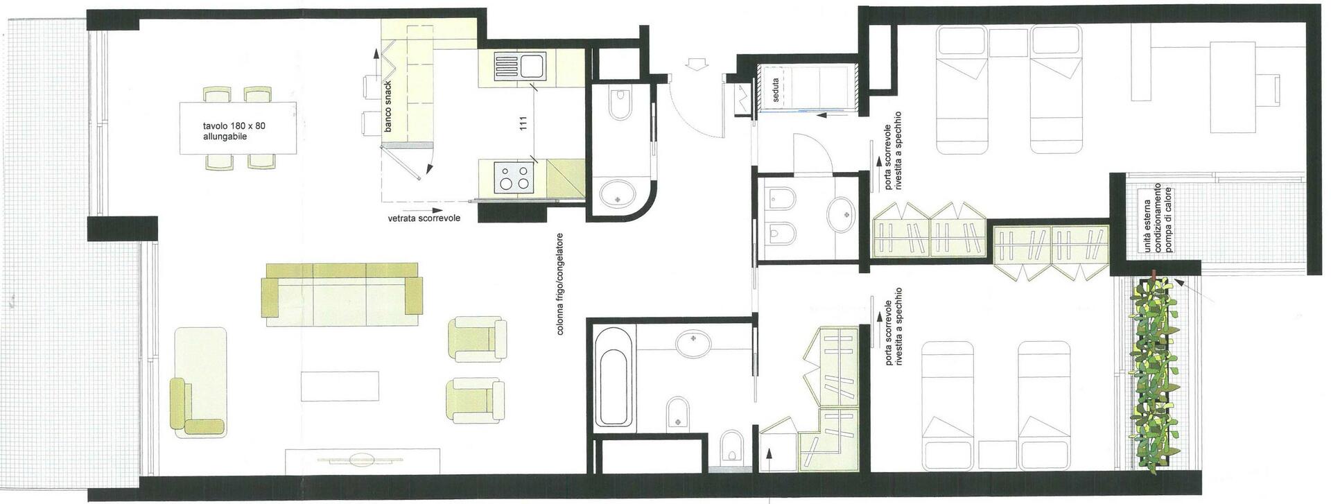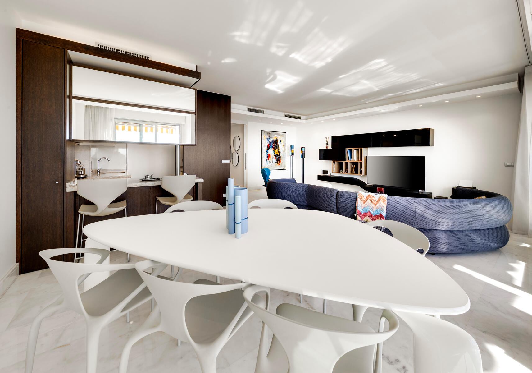 It features a spacious living area opening onto a terrace with a beautiful sea view, a fully equipped kitchen, two bedrooms, and two bathrooms.