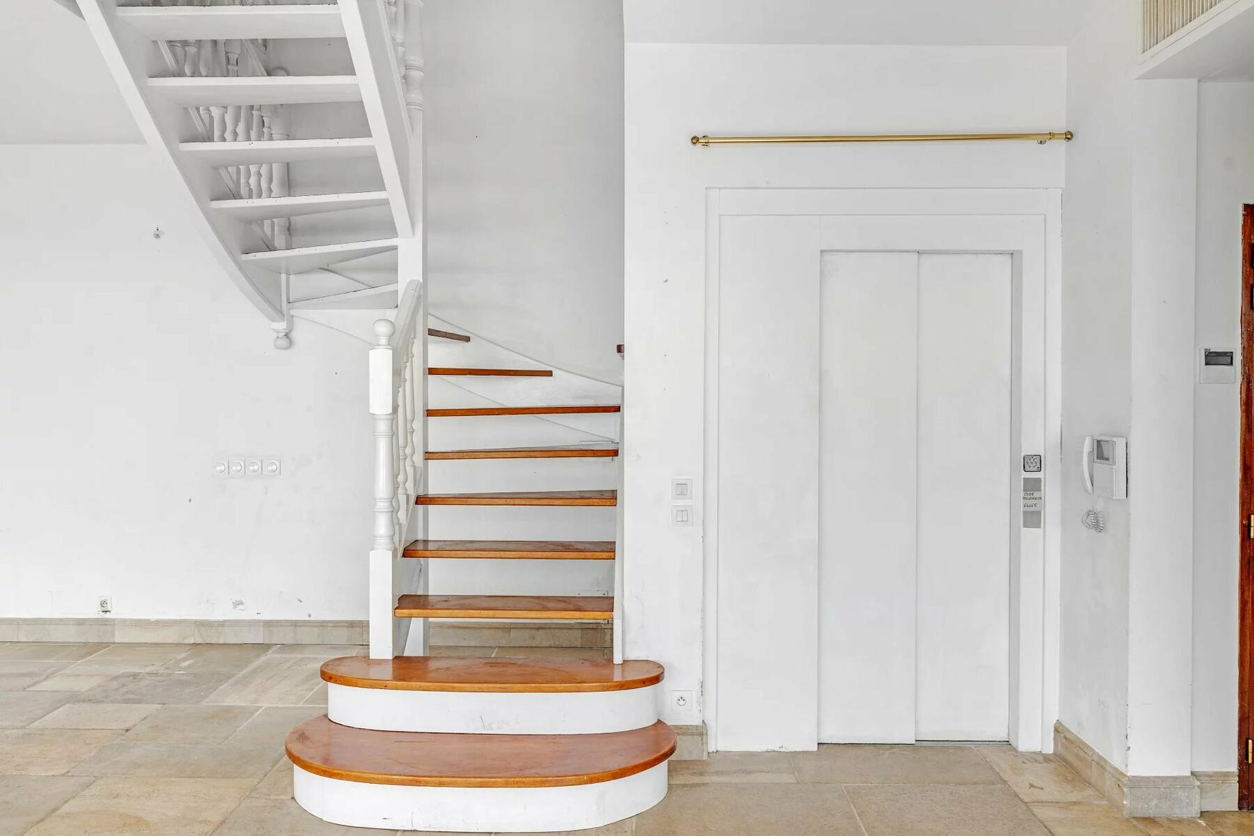 The garden level, reached via elevator or staircase, features a spacious 80 sqm living room flooded with natural light and opening onto the sea through large floor-to-ceiling windows. This level also offers a potential en-suite bedroom, a kitchen, a laundry room, a bar area, and a generous terrace, seamlessly connecting indoor and outdoor living.