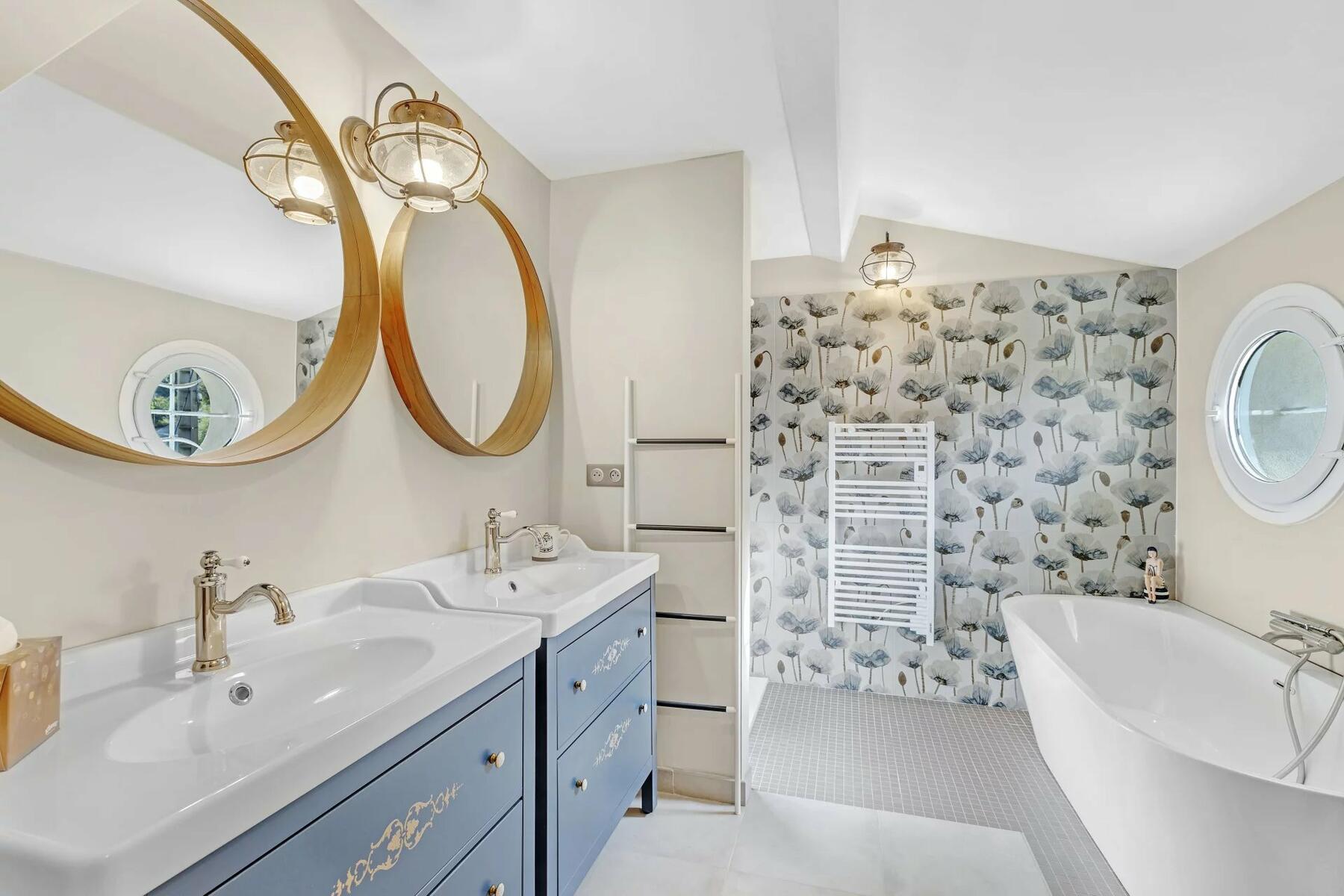 On the ground floor, the bright and generous living room opens onto a fully equipped modern kitchen, both extending onto a shaded terrace and sparkling pool. Of the two en-suite bedrooms on this level, one opens directly onto the garden, offering sea views that captivate from sunrise to sunset.
