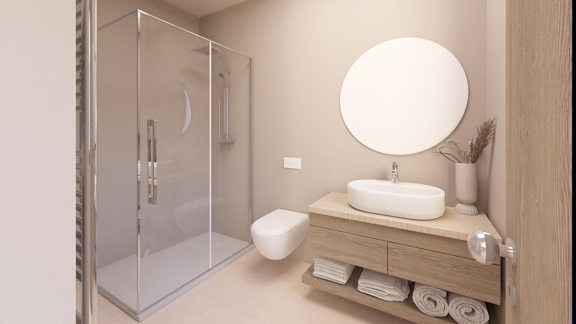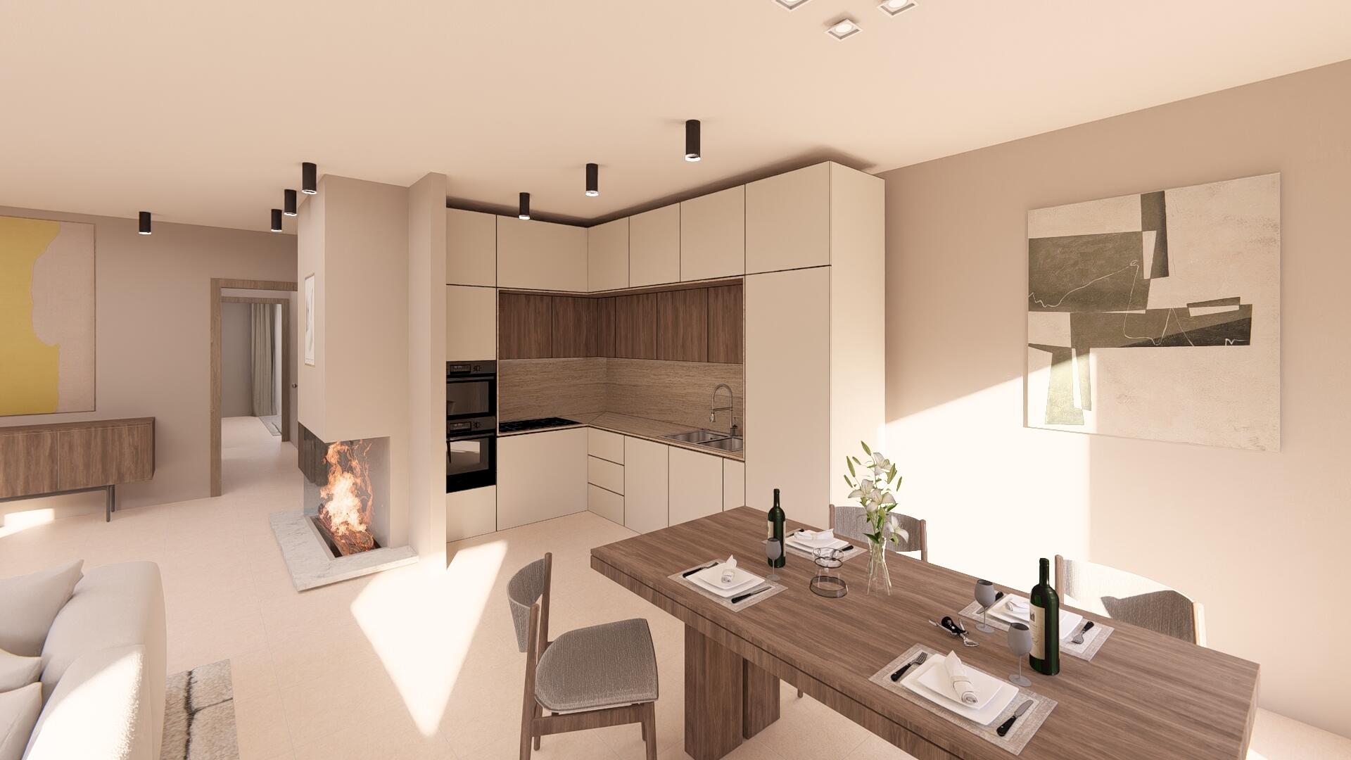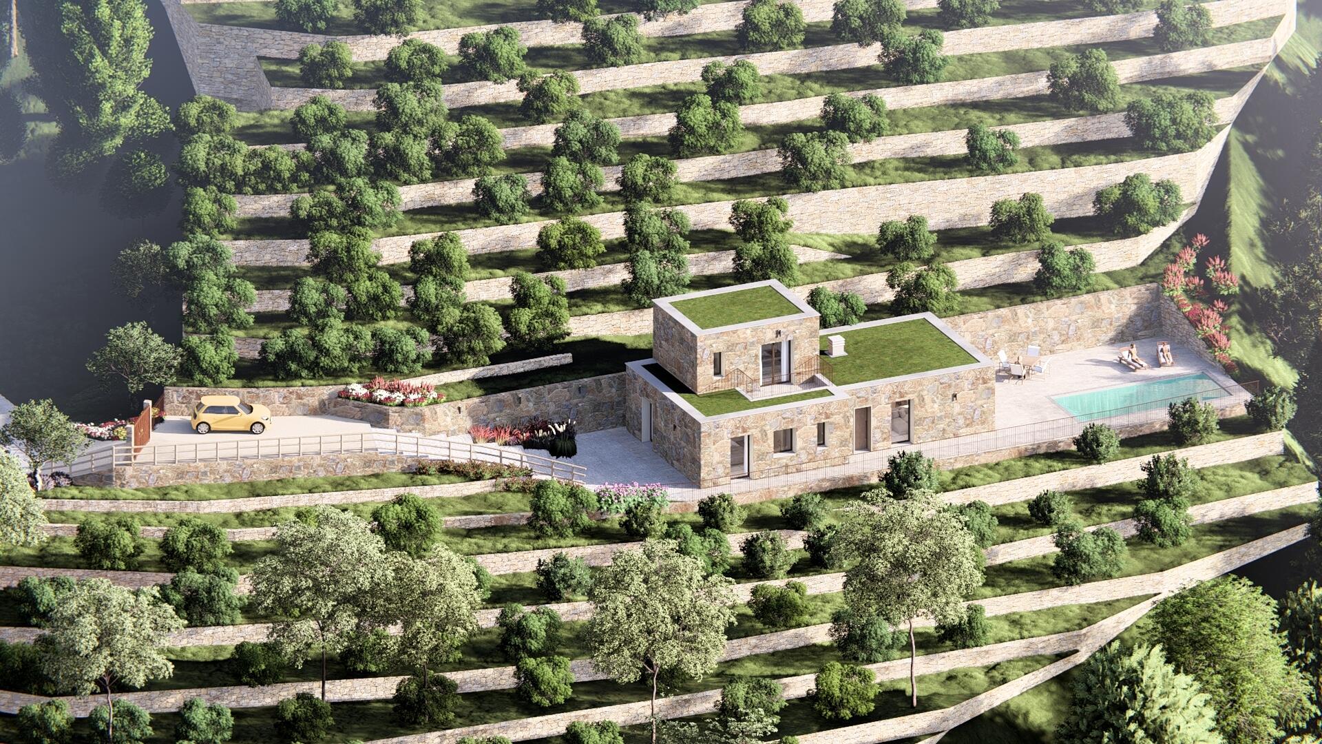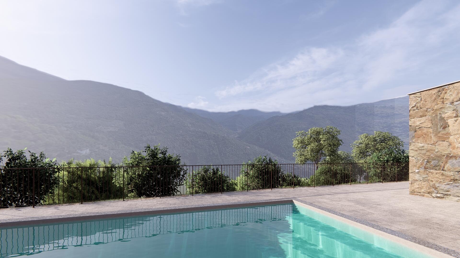 The interior consists of a large living room with fireplace and an open kitchen with dining room giving direct access to the swimming pool. Two en-suite bedrooms and a guest toilet occupy the ground floor, while upstairs, an en-suite bedroom enjoys a private terrace with stunning views.