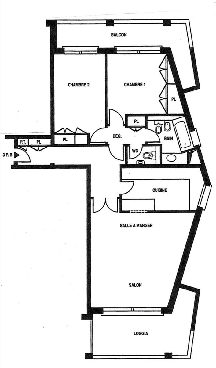 This apartment opens through an entrance hall with built-in cupboards, leading to the front to the living room opening on a large terrace, a separate kitchen with serving hatch, and at the back the hallway leads to two bedrooms with built-in storage opening onto a shared balcony, one of which has an en-suite bathroom, separate shower room.