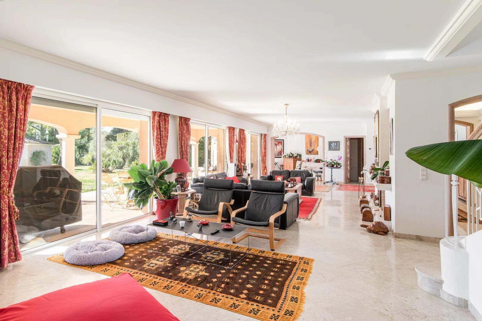 Offering approximately 395 sqm of living space, the villa stands out for its generous volumes and its expansive single-level living area, allowing for a fluid layout and optimal everyday comfort. The reception areas open seamlessly onto the terraces, garden and swimming pool located on the same level, creating ideal indoor–outdoor living.