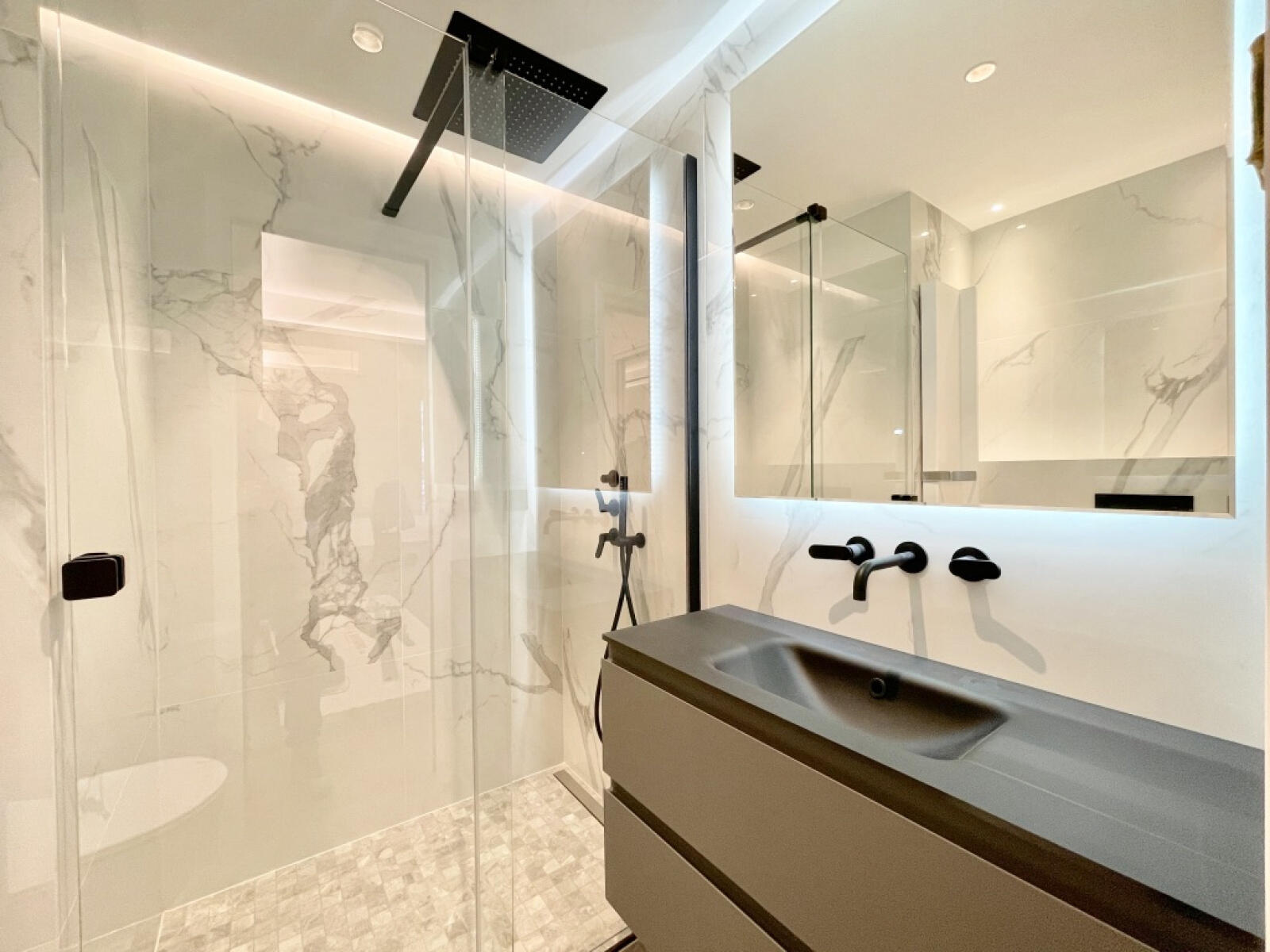 The apartment benefits from reversible air conditioning and plenty of built-in custom-made storage.