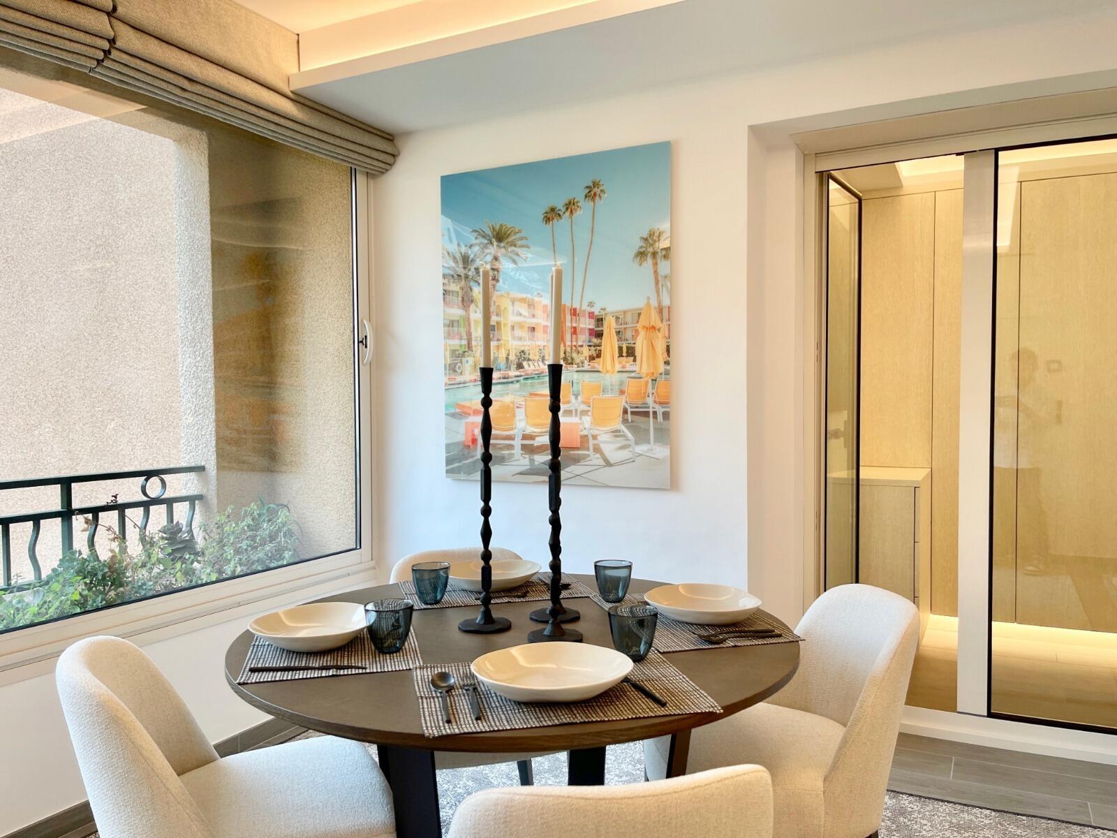 The sleeping area includes a beautiful bedroom with dressing rooms and a bathroom with toilet. The dining room can be easily transformed into a second bedroom, creating an additional sleeping area with its own shower room and WC.