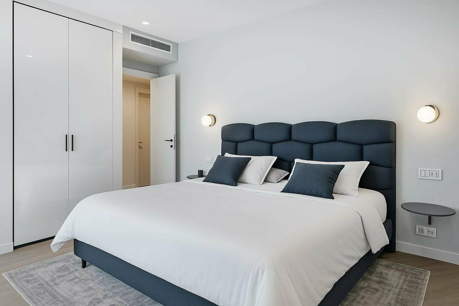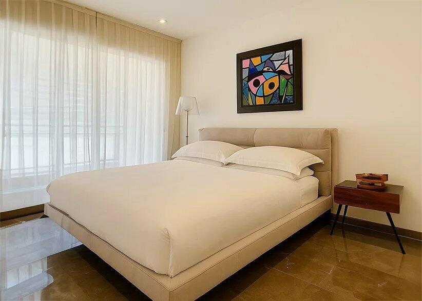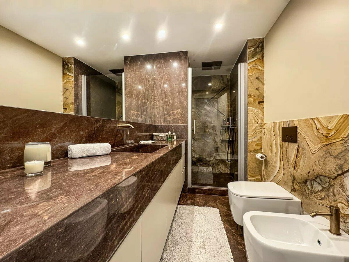 The apartment offers three luxurious bedrooms, each with its own modern en-suite marble bathroom, generous built-in wardrobes, and a stylish walk-in closet.