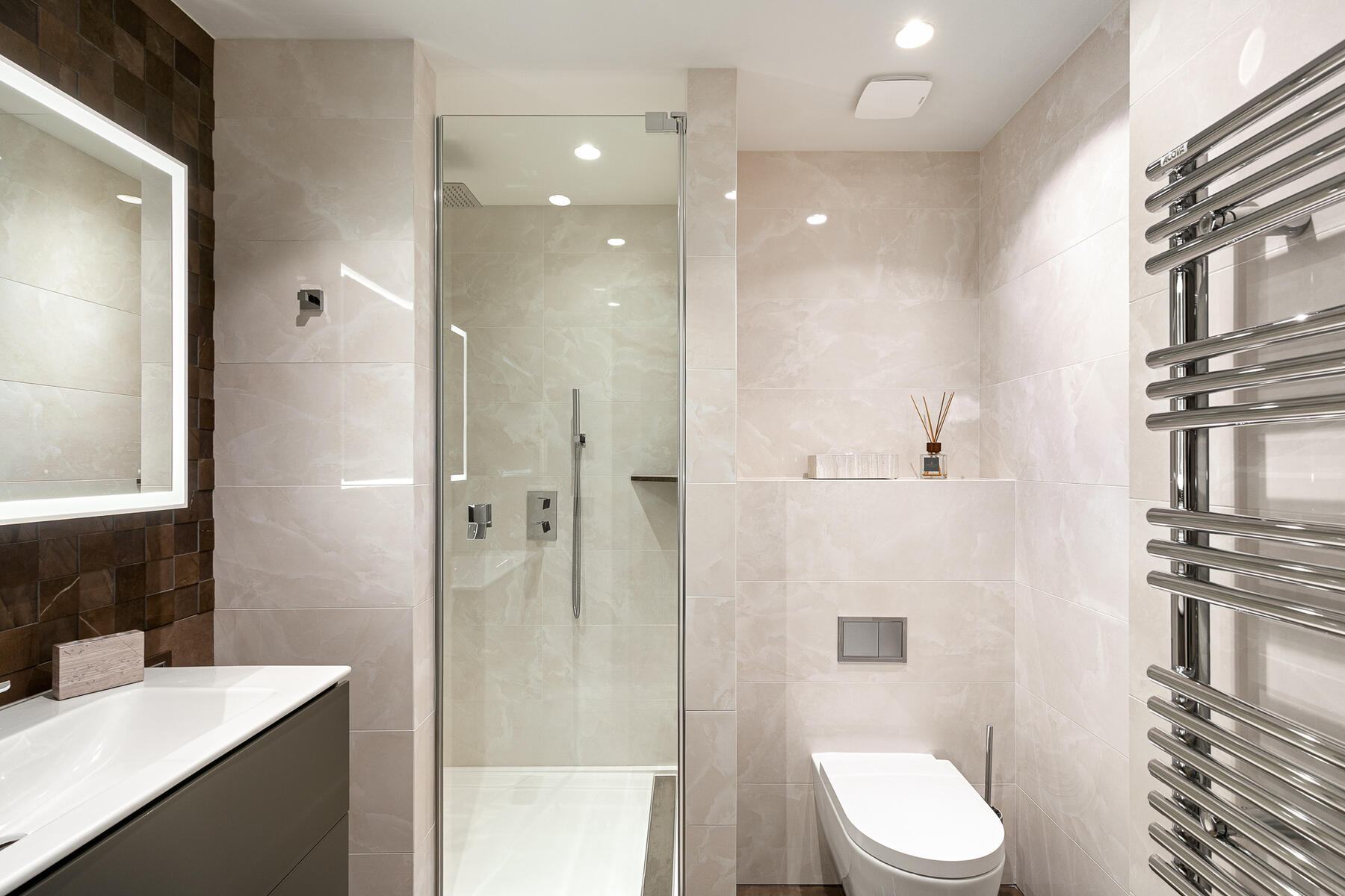 The apartment features an entryway with built-in storage closets, an elegant bathroom equipped with a shower, a toilet, a vanity with storage cabinet, and a lighted mirror.