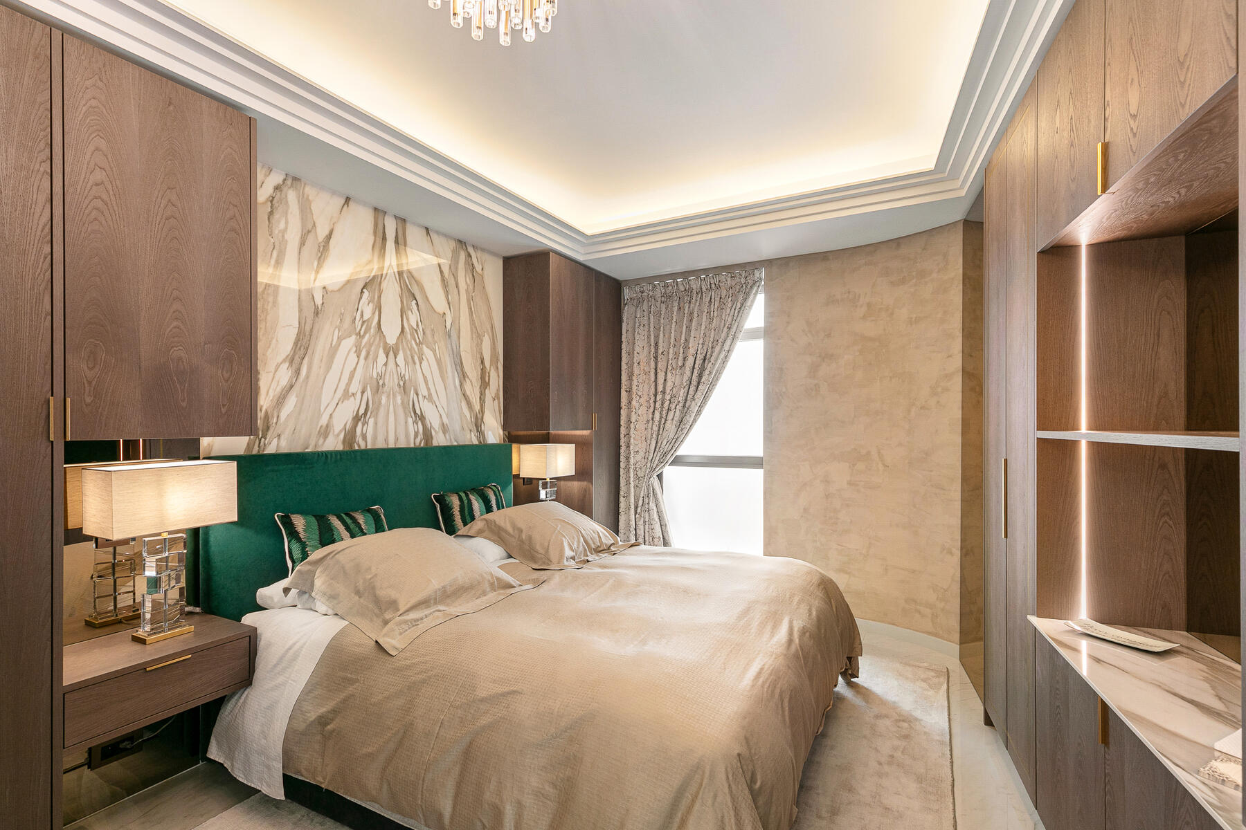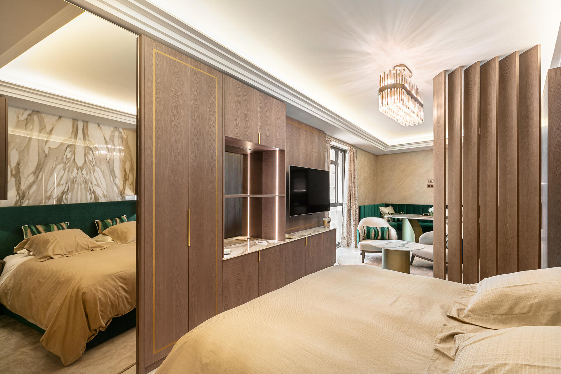 A wall-mounted TV unit with cabinets completes the look, while backlit crown molding and a central chandelier enhance the apartment’s ambiance.