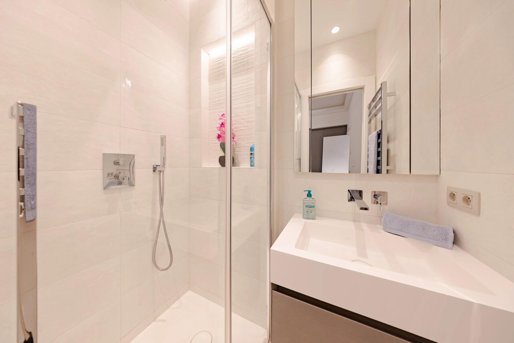 The living space consists of a bright living room with an open kitchen, elegantly furnished and equipped with many custom storage solutions. The sleeping area offers two beautiful bedrooms, each with its own shower room and toilet, providing comfort and privacy. An guest toilet completes this property.
