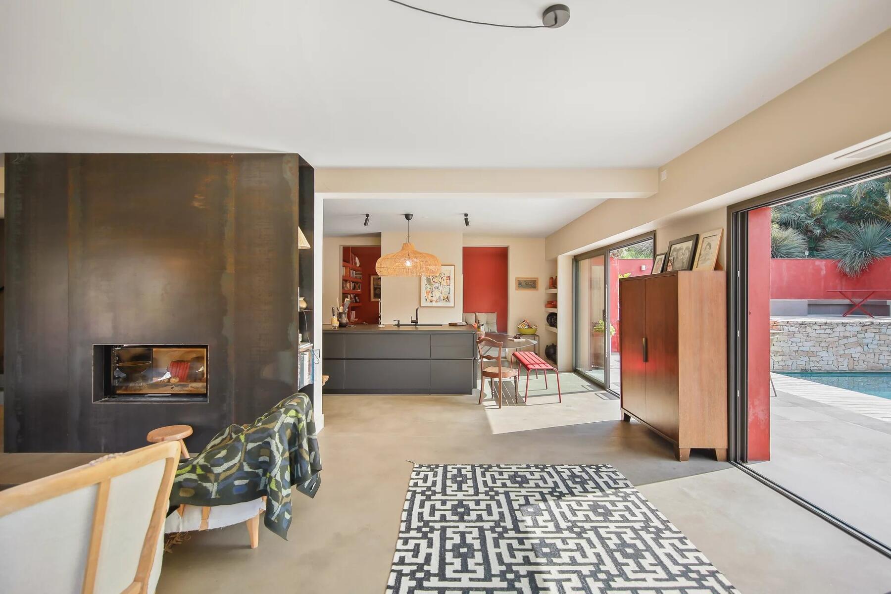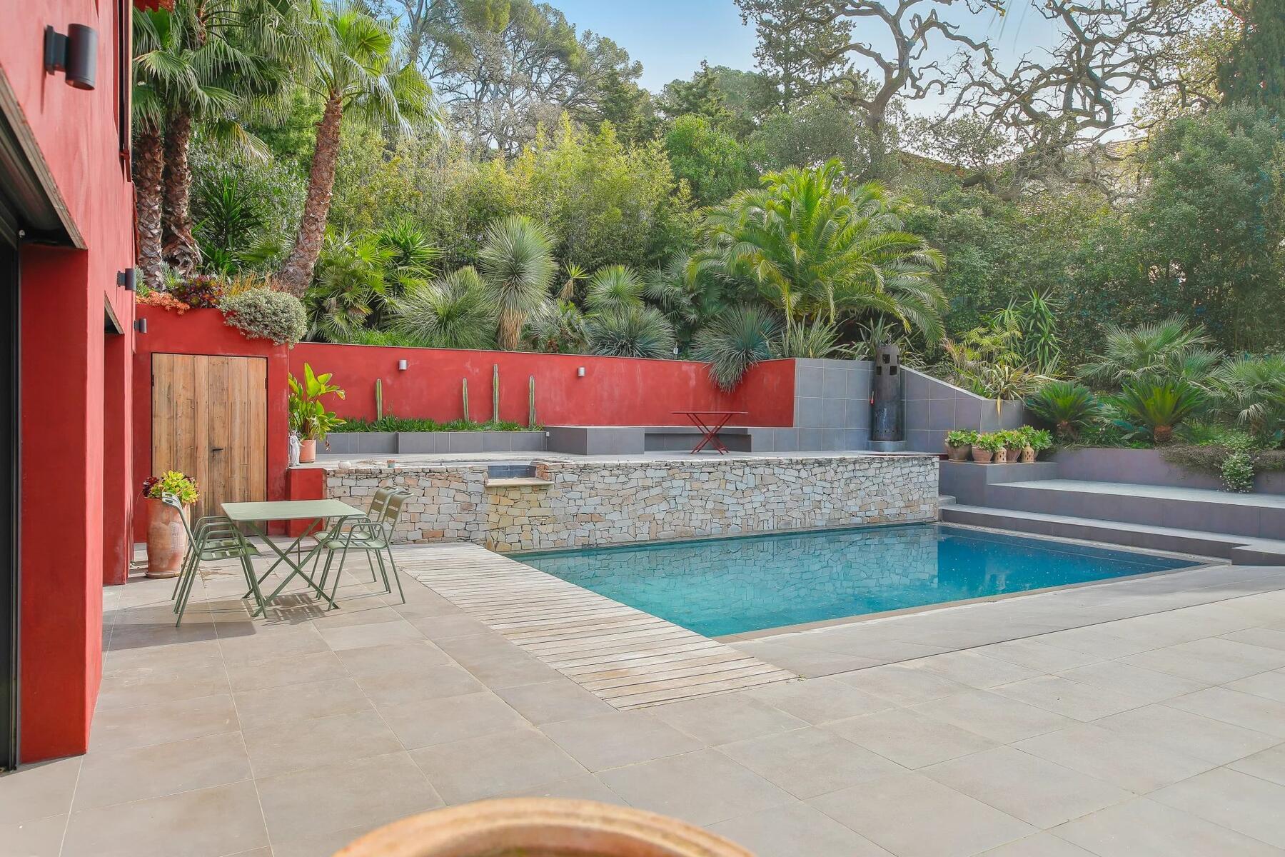 Outdoors, the swimming pool, pool house, and terraces blend seamlessly into the lush surroundings, creating a serene and private atmosphere.