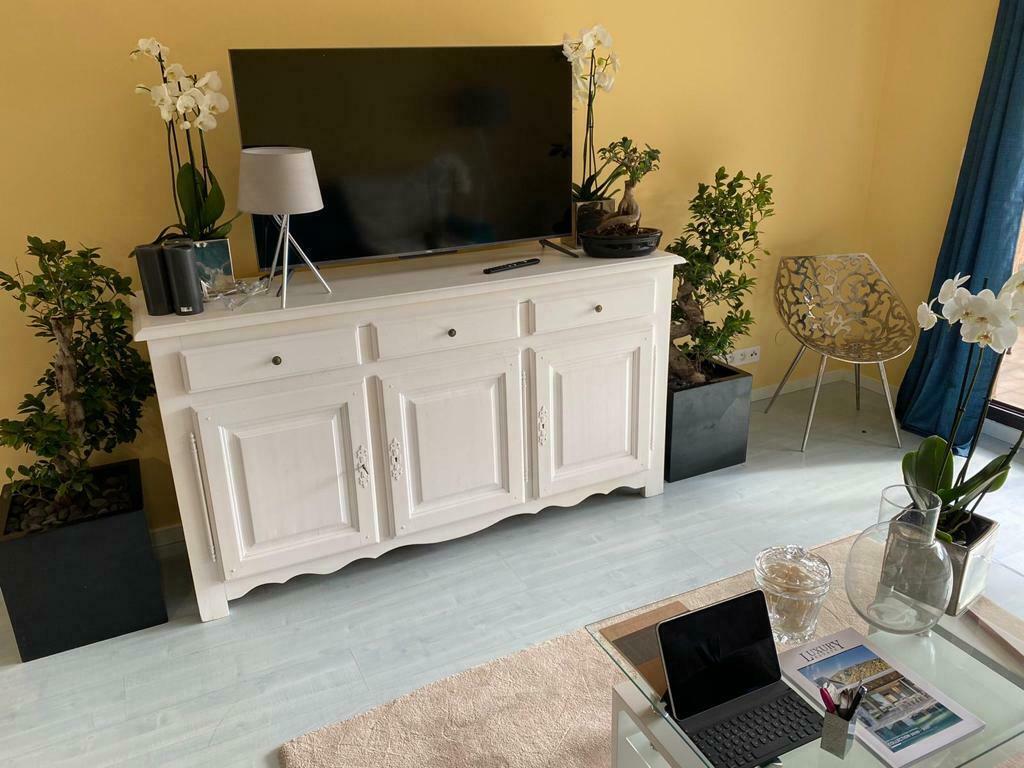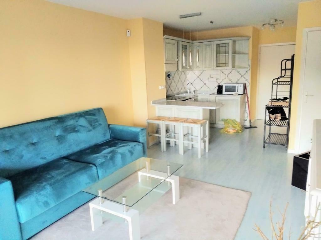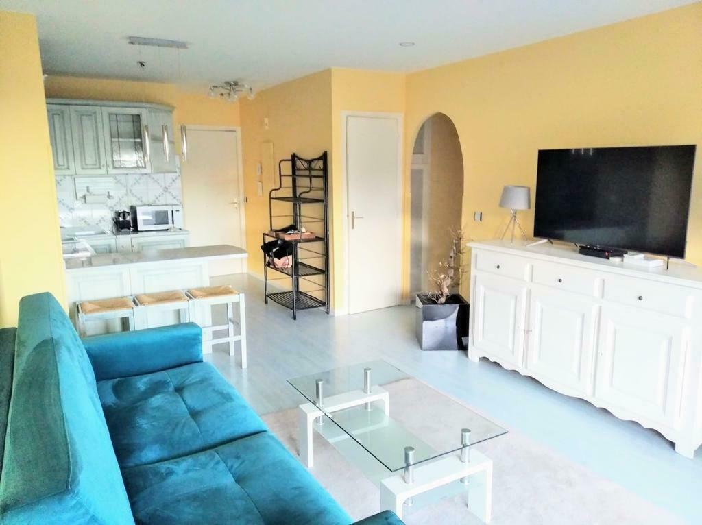 Dans une residence avec concierge et piscine, appartement composé d'un séjour avec cusine ouverte, une chambre, une salle de bains, un dressing et une grande terrasse offrant une belle vue mer