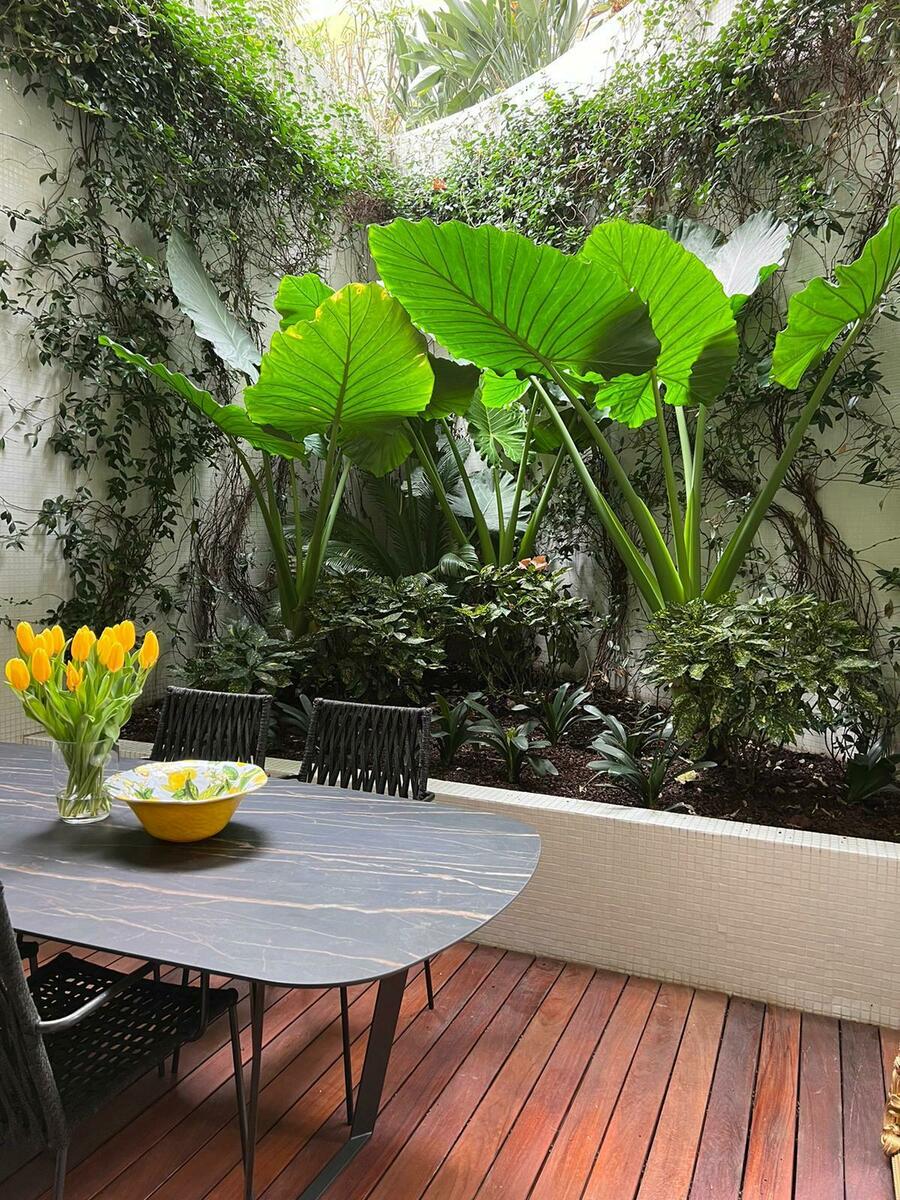 Niveau inférieur : Hall d'entrée, toilettes invités, cuisine entièrement équipée et ouverte sur le séjour, terrasse avec très beau jardin privatif arboré de plantes tropicales.