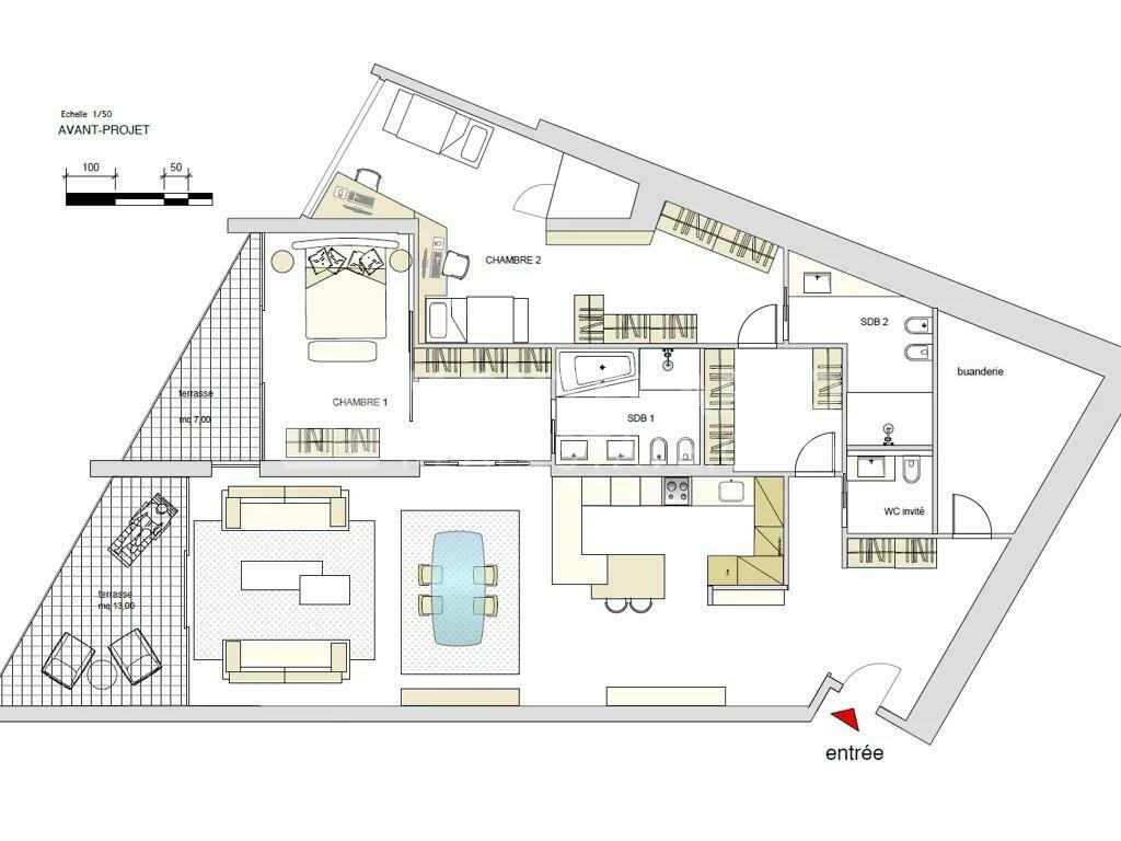 L'appartement a une belle surface habitable et les terrasses sont tres larges. L'appartement se compose d'une entrée, salon/ salle à manger, une chambre, 2 salles de bains et une cuisine indépendante.