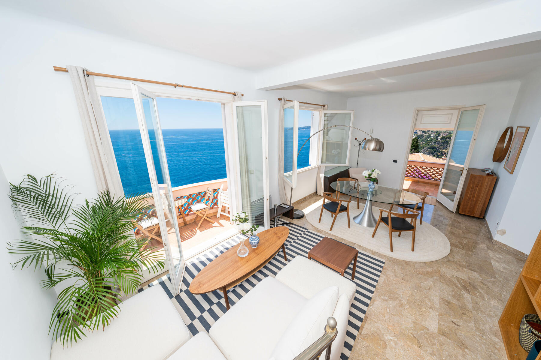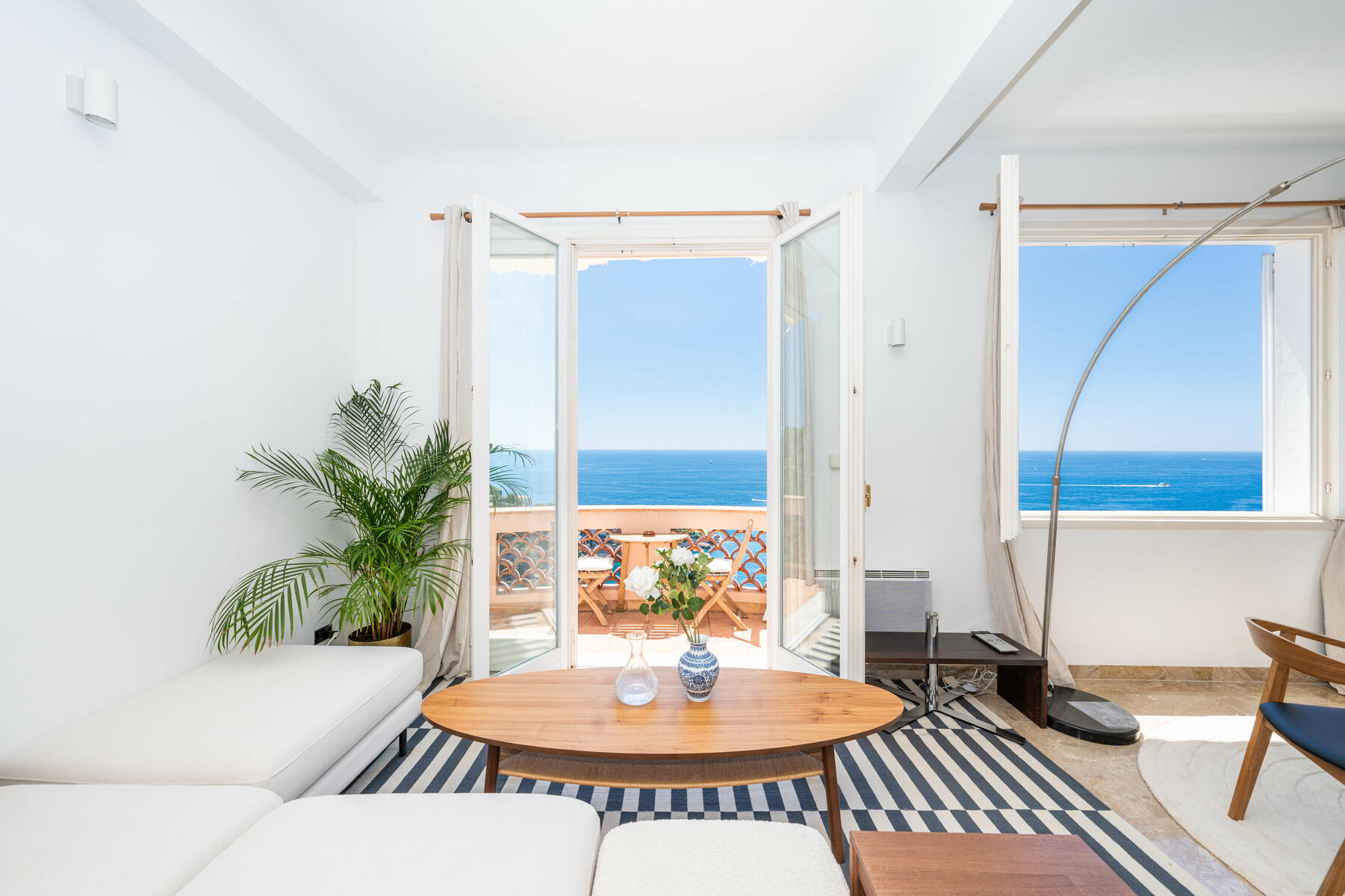 D'une superficie habitable de 95 m2, baigné de lumière naturelle, il se compose d'une entrée accueillante, d'un double salon offrant une vue époustouflante sur la mer, d'une cuisine entièrement équipée, de 2 chambres et de 2 salles de bains.