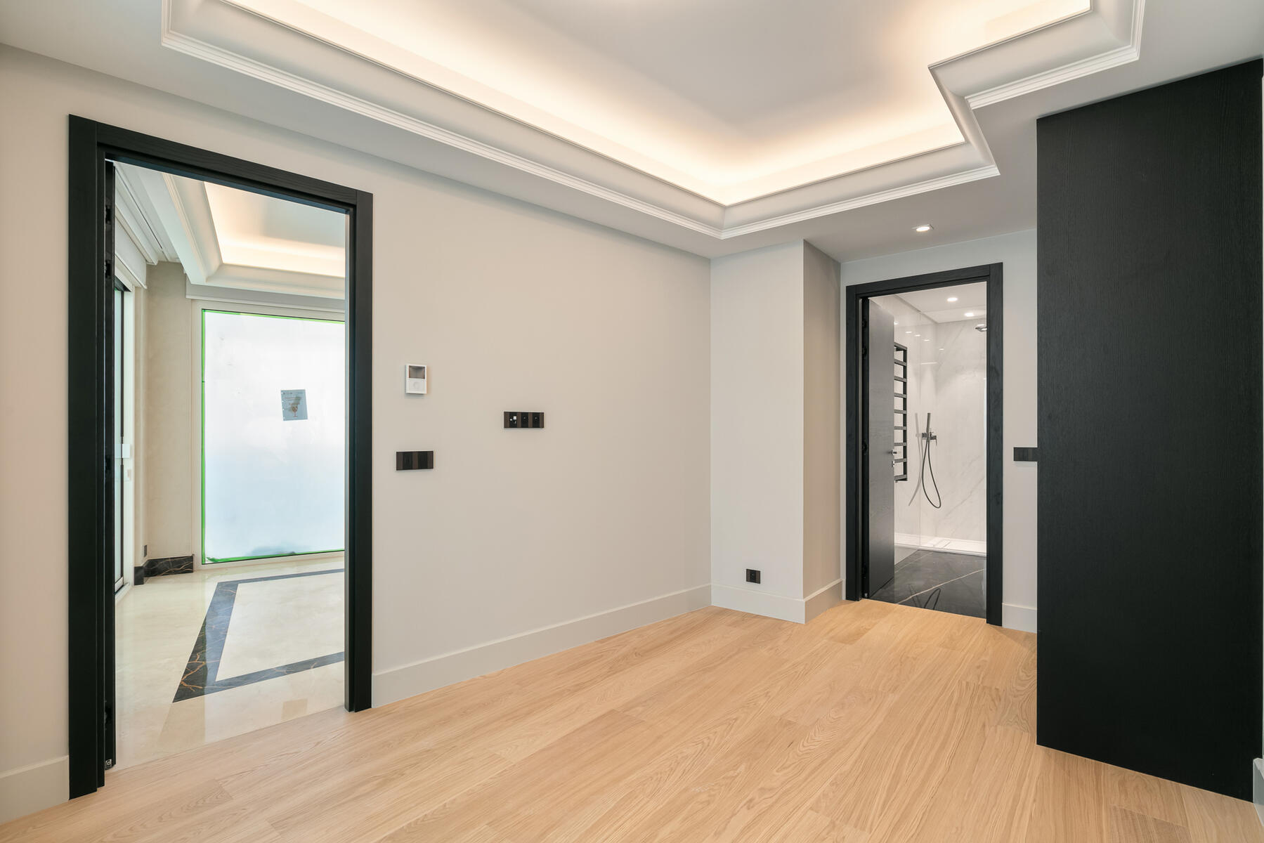 La chambre possède un placard menuisé avec éclairage intérieur, du parquet au sol ainsi qu'une tête de lit moulurée et une salle de douche avec double vasque.