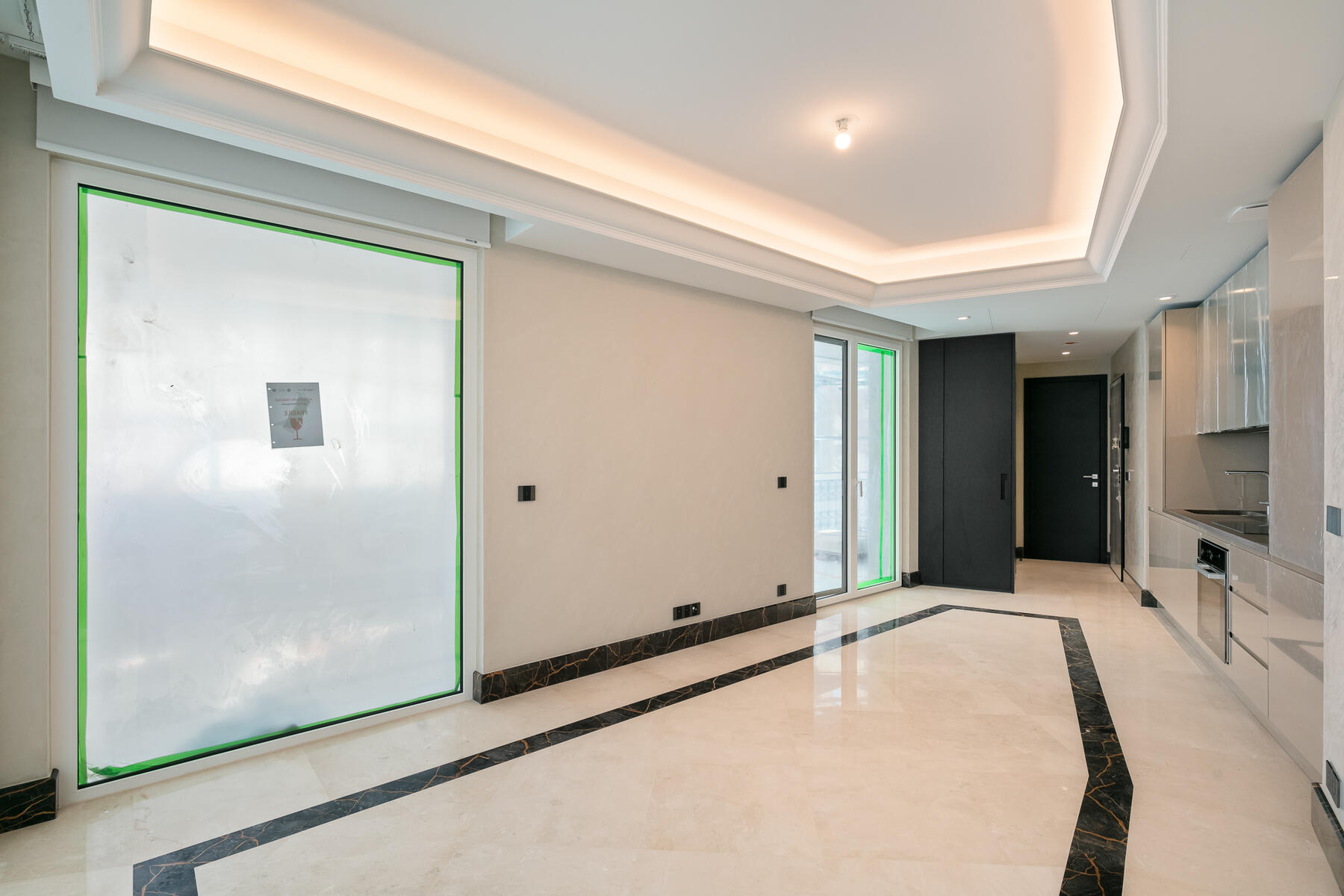 Le séjour lumineux bénéficie de deux marbres différents au sol, du stuc aux murs et d'une corniche rétroéclairée au plafond.