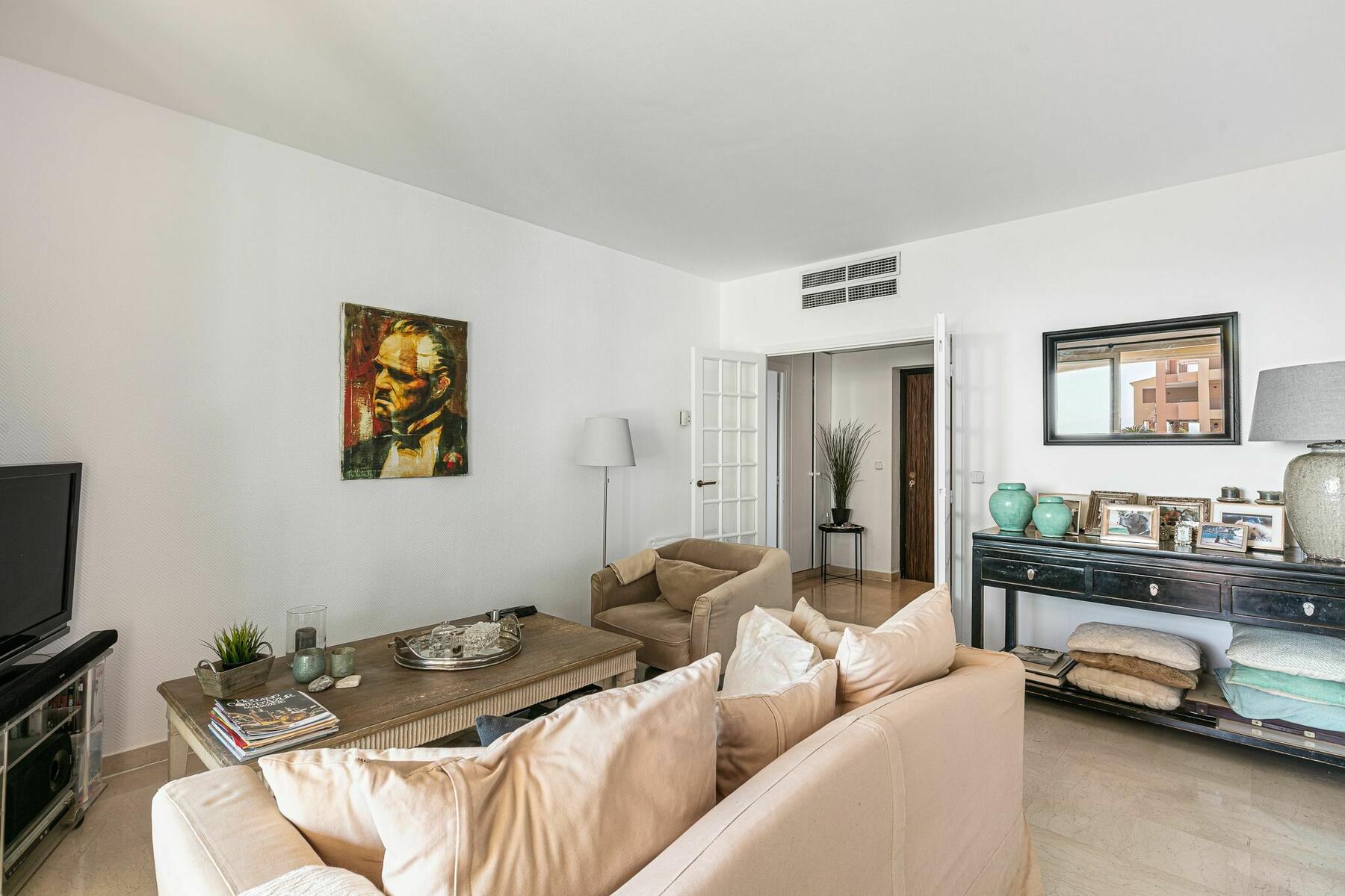 Il se compose d'une grande entrée, de toilettes invités, d'un séjour spacieux et lumineux ouvert sur une loggia avec vue sur mer et piscine, d'une salle de bains moderne rénovée, d'une vaste cuisine équipée et d'une chambre confortable donnant sur la loggia vue mer.
