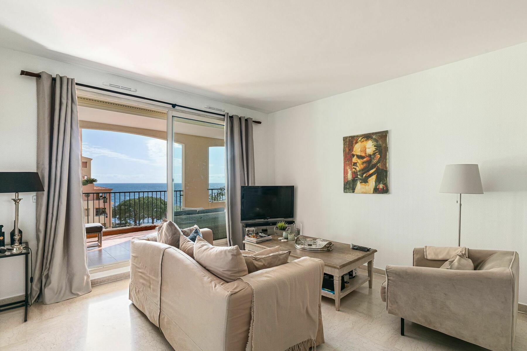 Cet appartement, au 5ème étage, vous offre une loggia avec vue sur mer, piscine et placette.