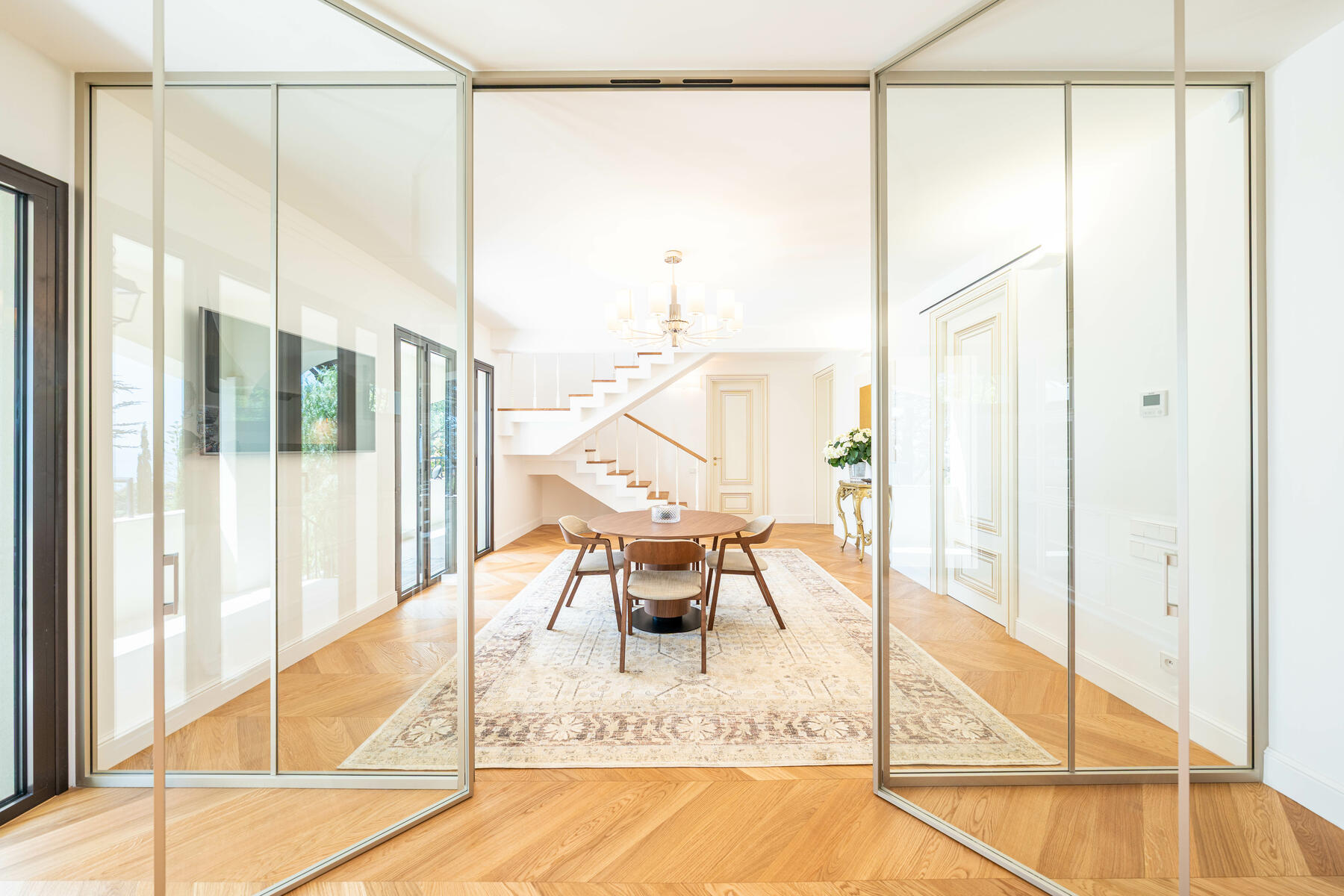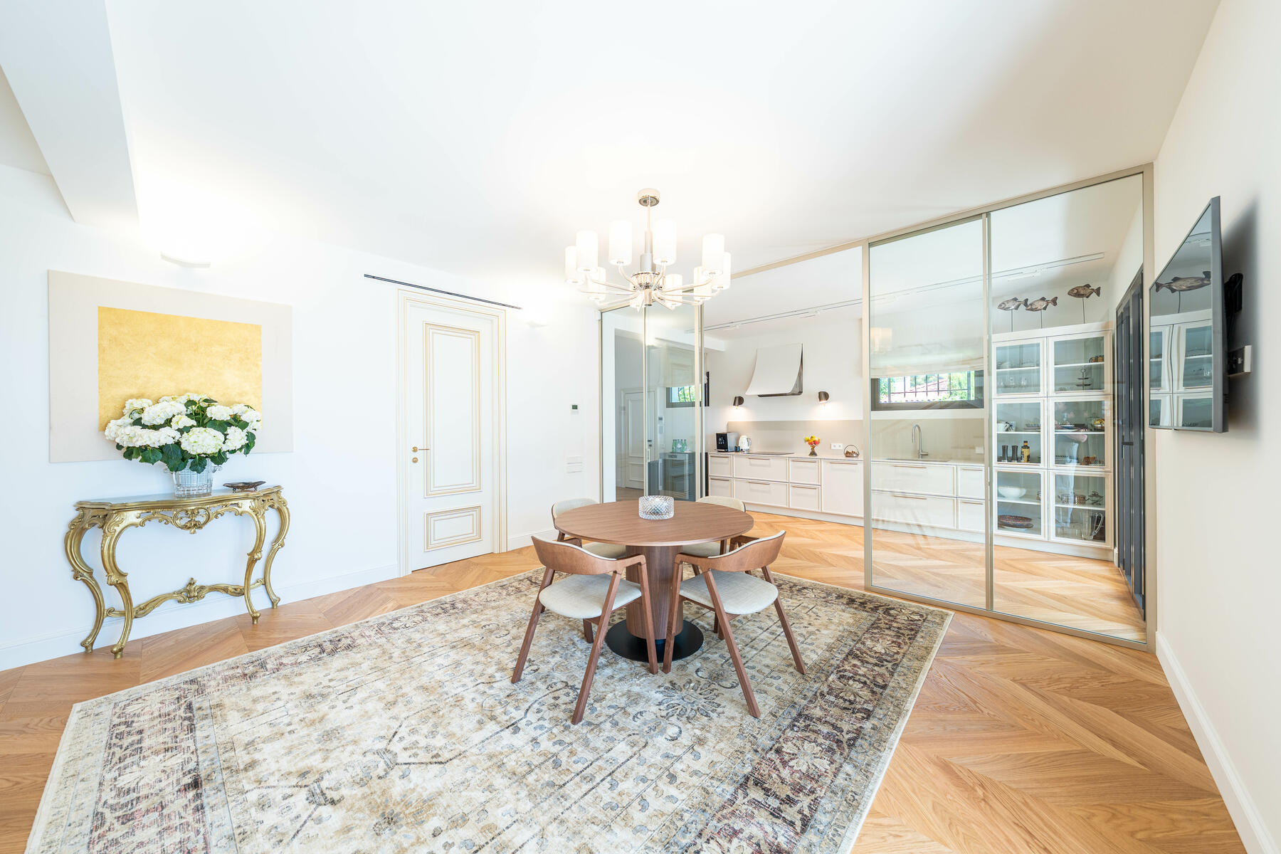 Au rez-de-jardin, vous trouverez une élégante salle à manger avec cuisine ouverte, deux chambres supplémentaires et deux salles de douche.