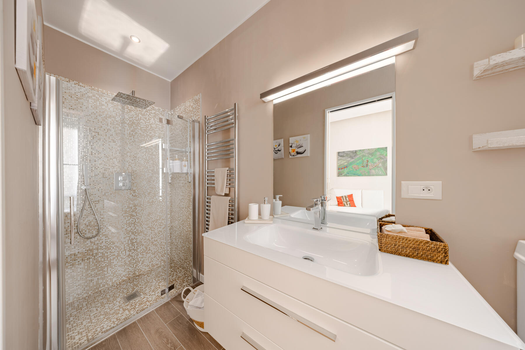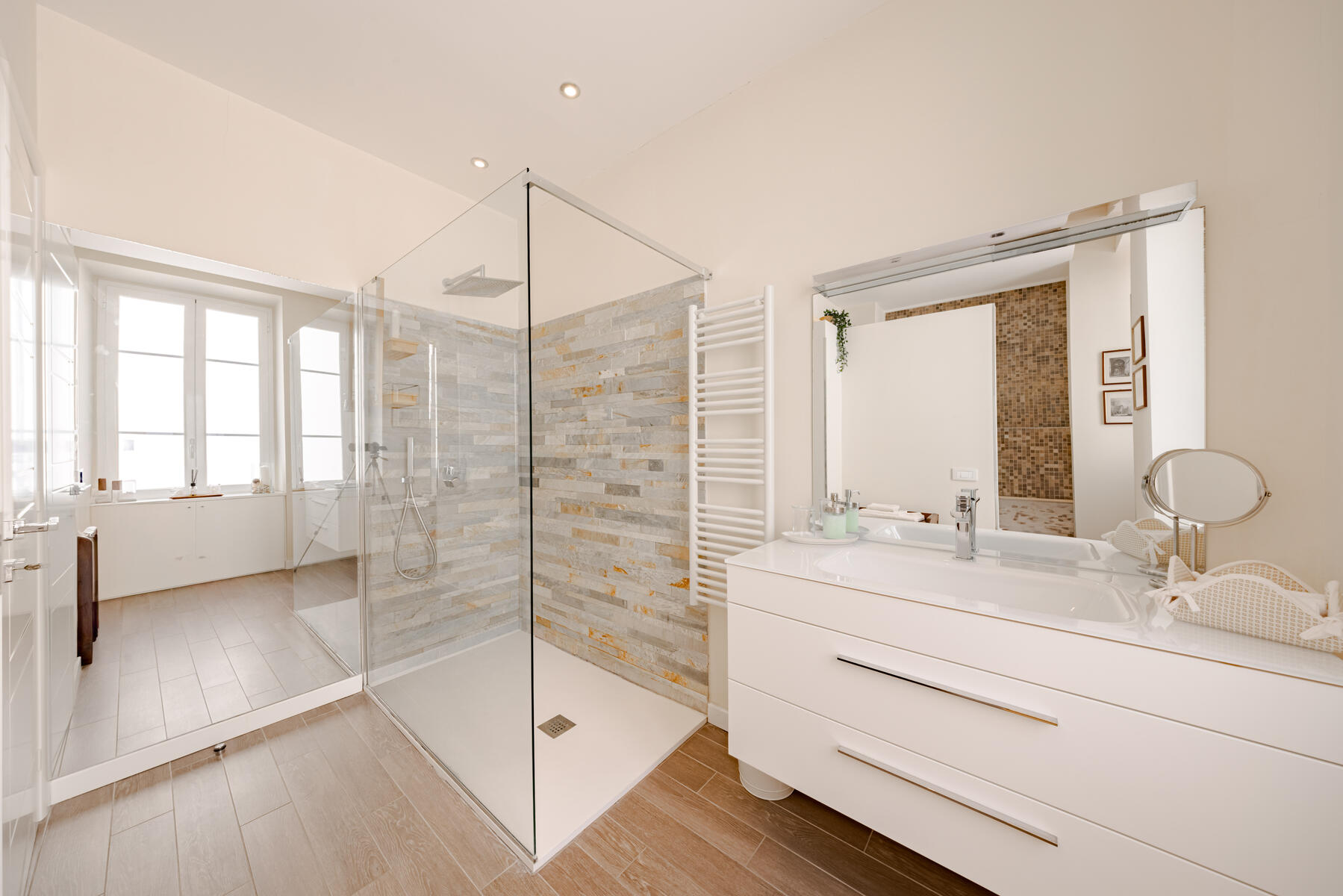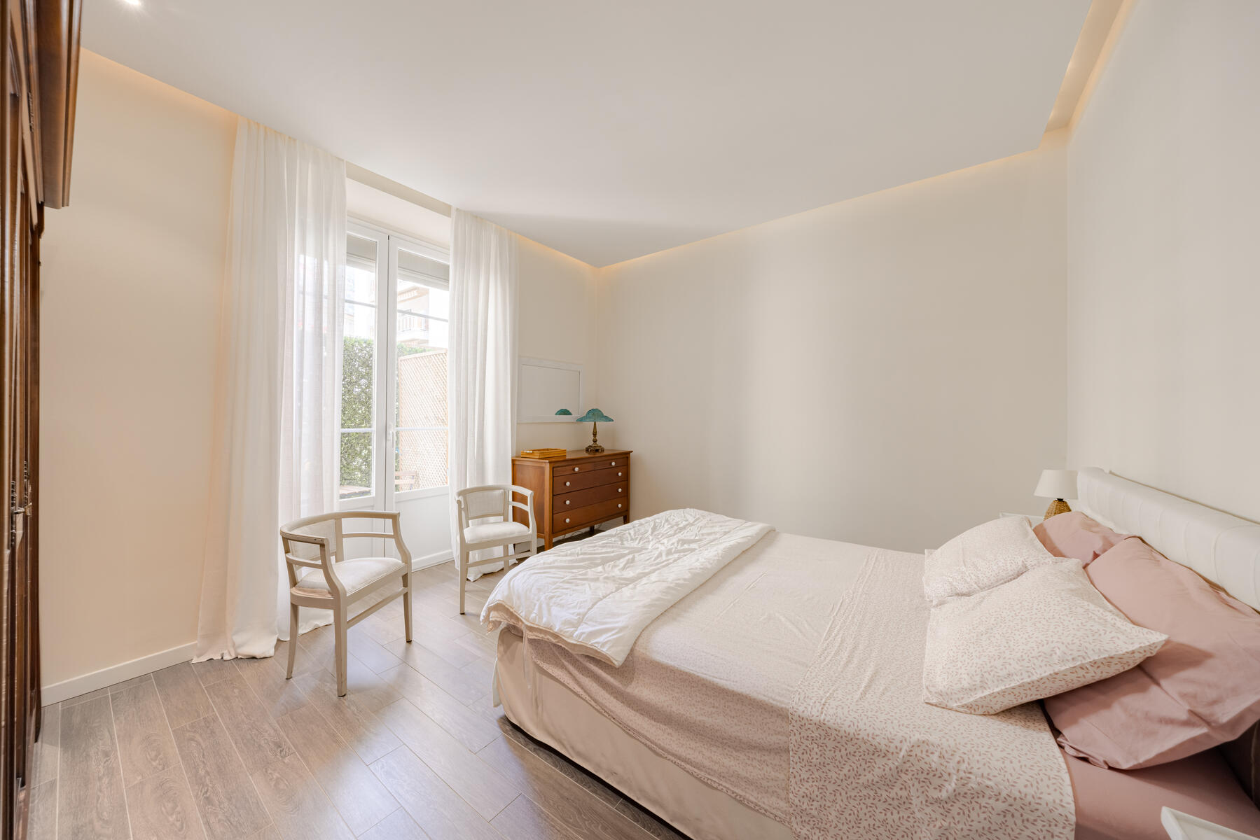 L’appartement propose deux chambres confortables : l’une s’ouvre sur un petit balcon plein de charme, l’autre bénéficie d’une salle de douche privative avec toilettes. Une seconde salle de douche spacieuse, également équipée de toilettes, complète ce bien aux prestations soignées.