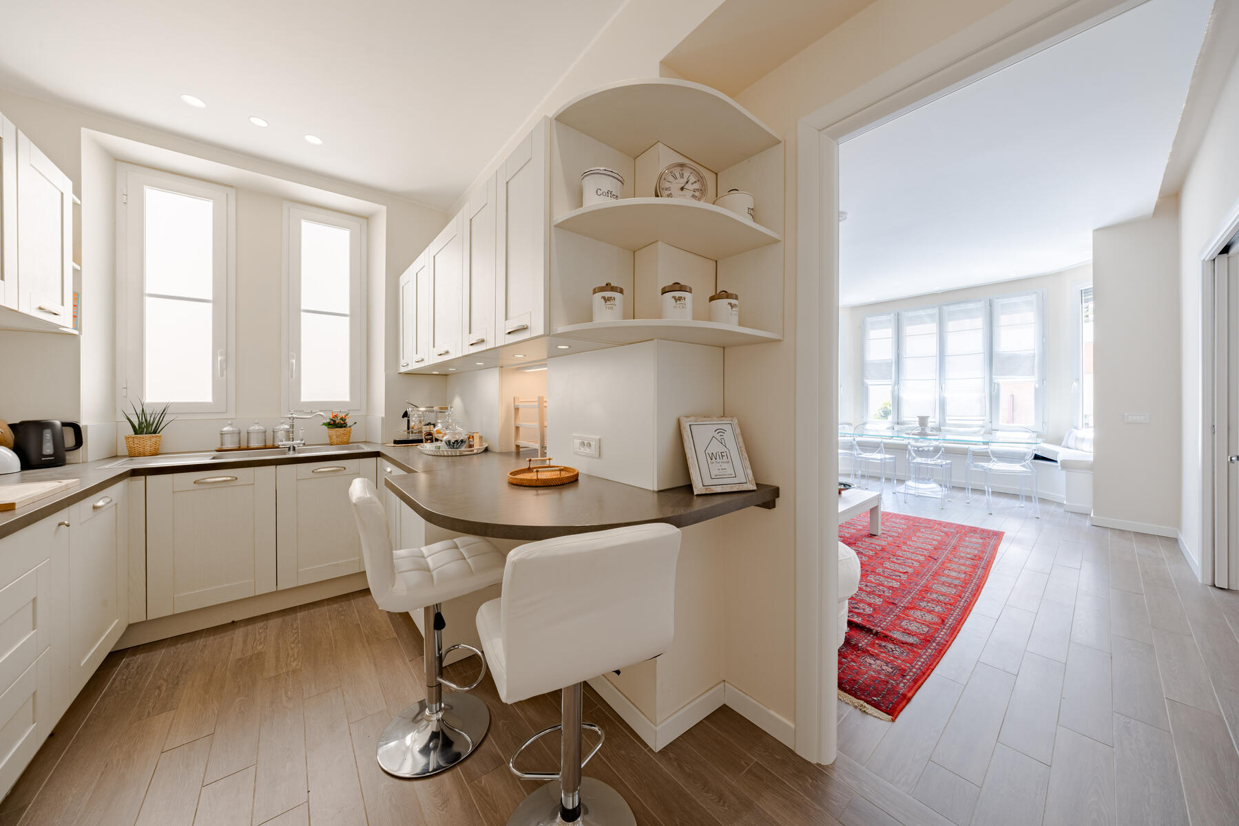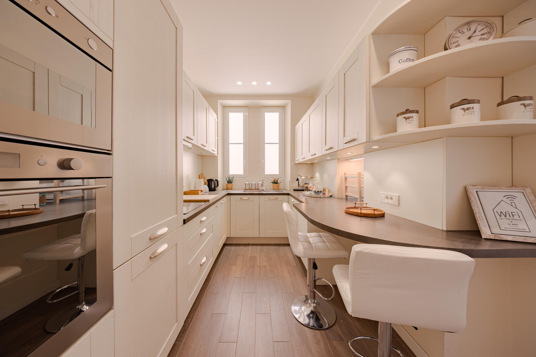 D’une superficie d’environ 130 m², il a fait l’objet d’une rénovation complète avec des matériaux de grande qualité, dont un magnifique parquet en bâtons rompus qui confère un caractère raffiné à l’ensemble. L’espace de vie s’organise autour d’un double séjour baigné de lumière, sublimé par un bow-window, et prolongé par une cuisine ouverte, entièrement équipée et aménagée avec soin.