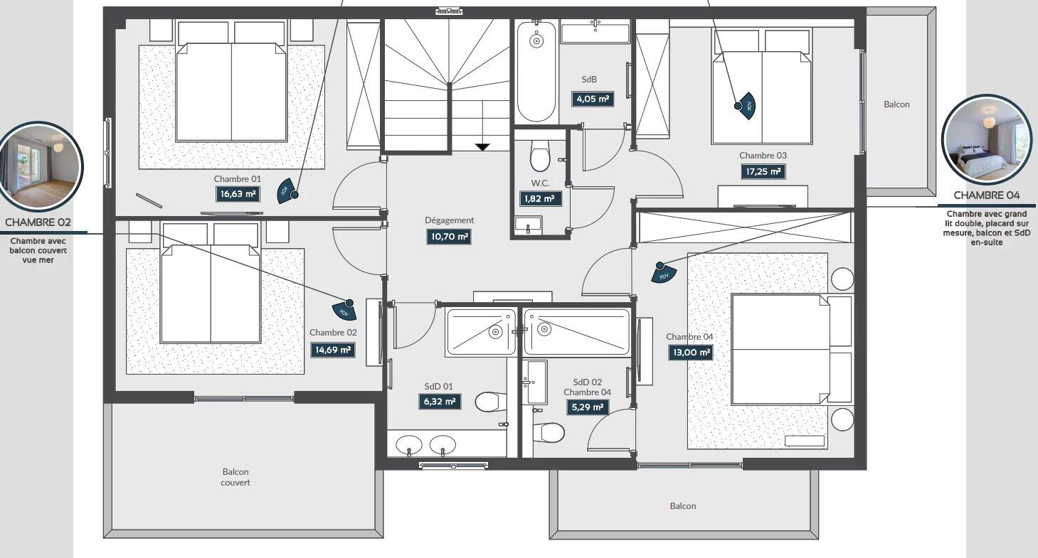À l’étage (89,75 m²) : Une grande chambre avec sa salle de bains privative, trois autres chambres, une salle de bains, une salle de douche, des toilettes invités, ainsi que trois balcons, dont un ouvert.