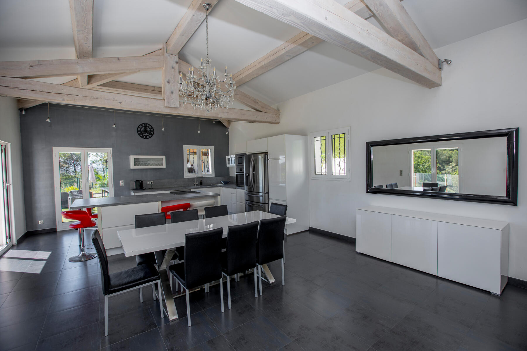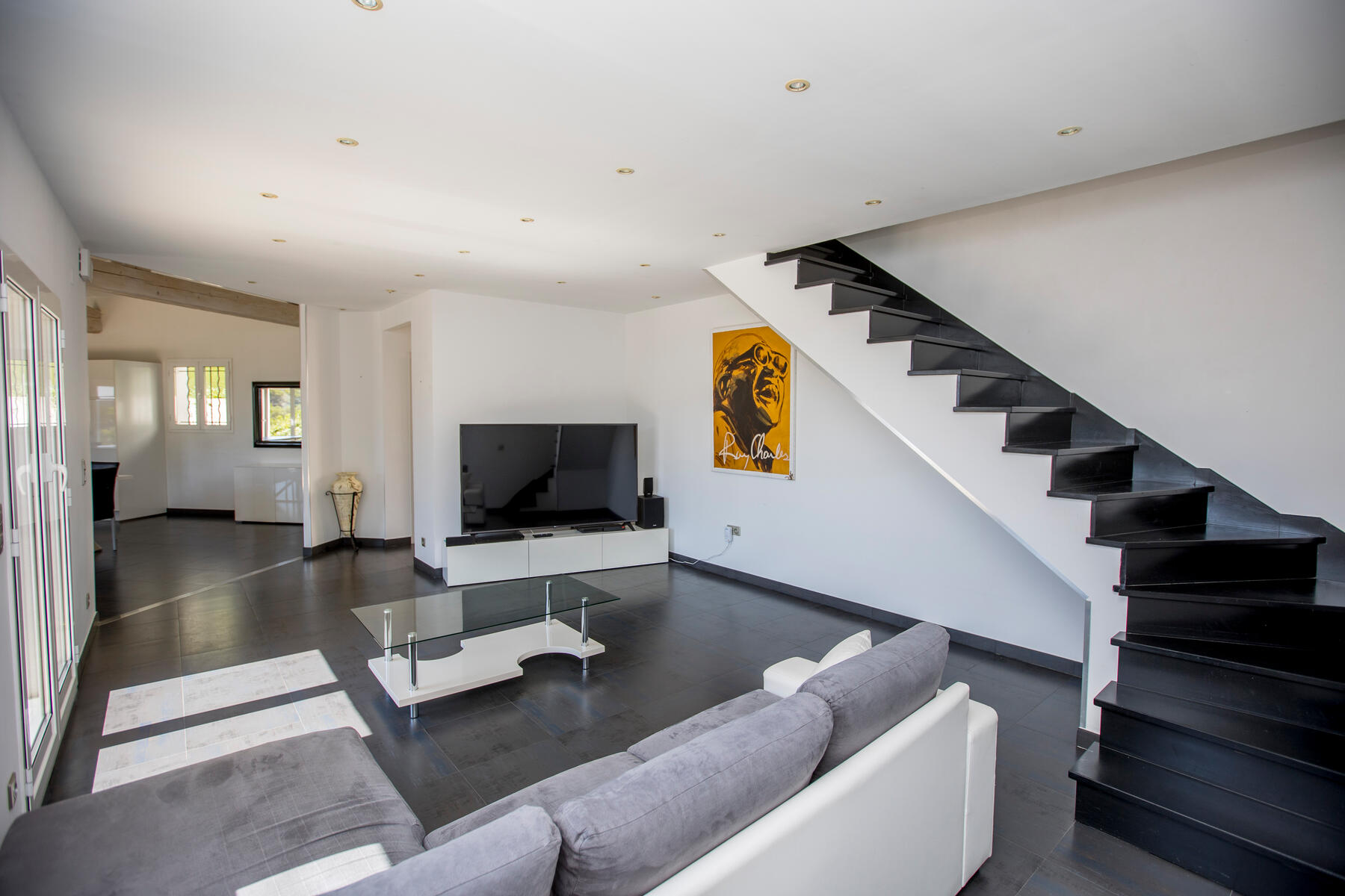 Baignée de lumière, la maison propose un vaste séjour avec grandes baies vitrées, une cuisine ouverte moderne, et une suite parentale de plain-pied avec dressing et salle de bains. À l’étage, deux chambres spacieuses partagent une salle de douche élégante. En rez-de-jardin, un studio indépendant avec kitchenette et salle d’eau permet de recevoir en toute autonomie.