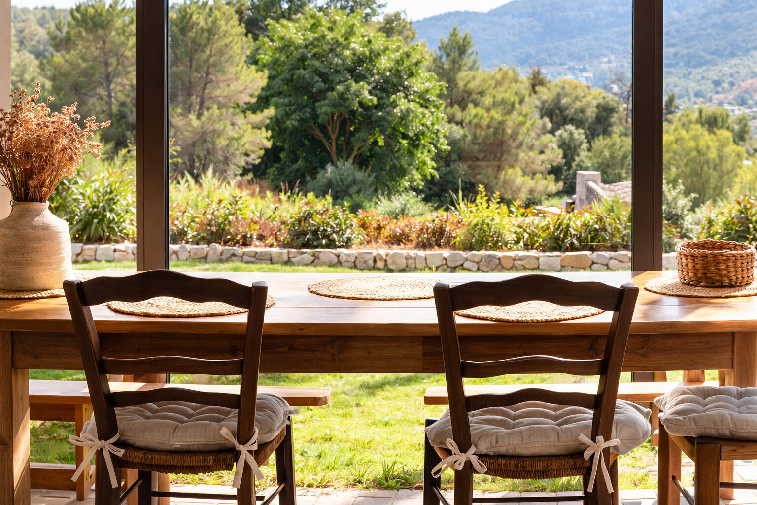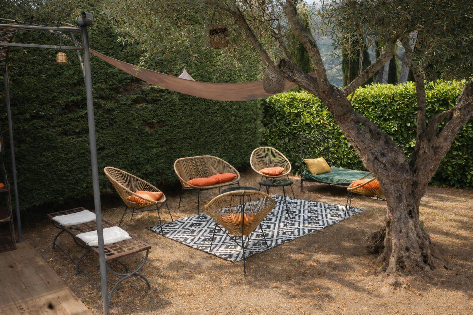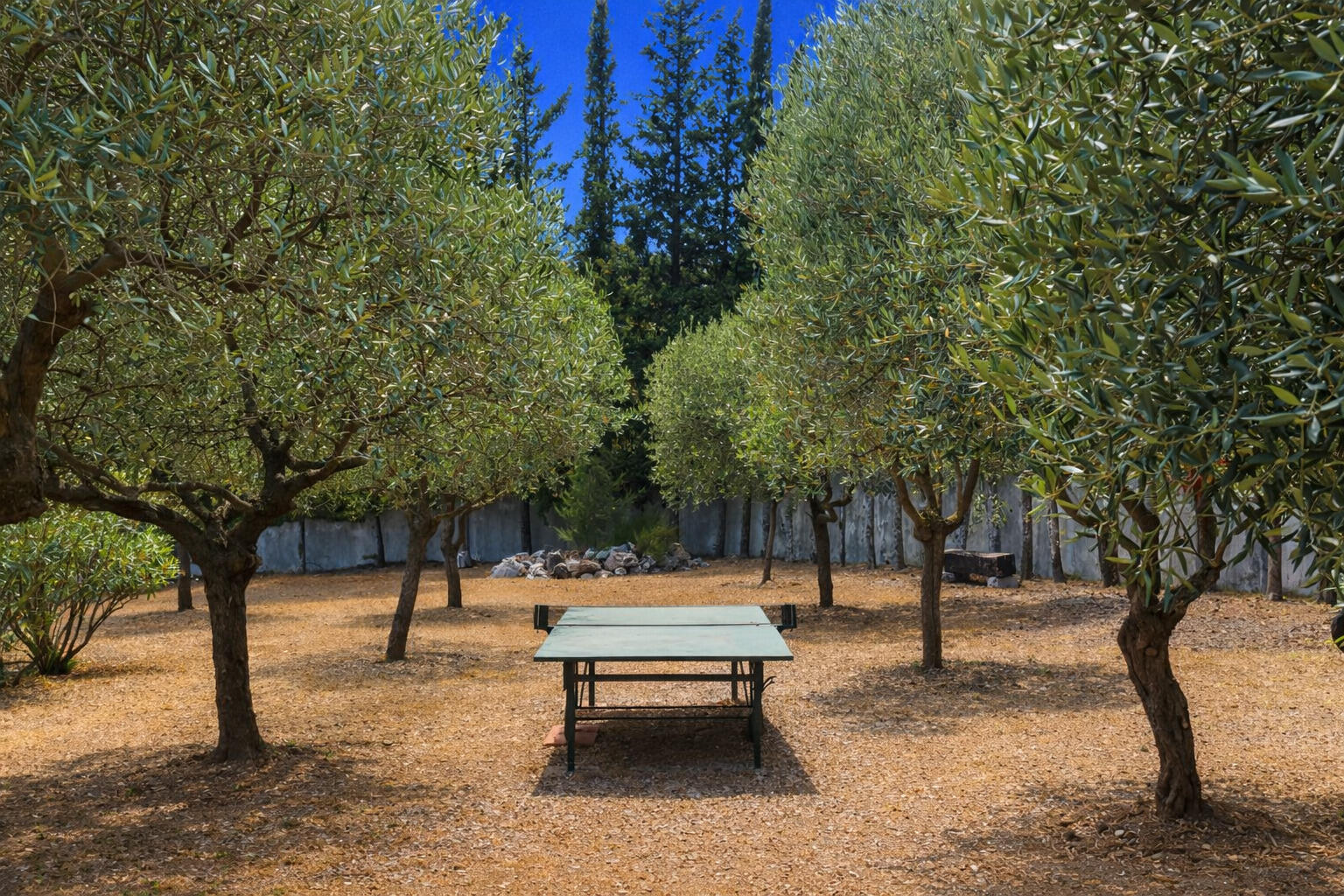 - Un lieu de vie extérieur couvert, bordé d'oliviers.