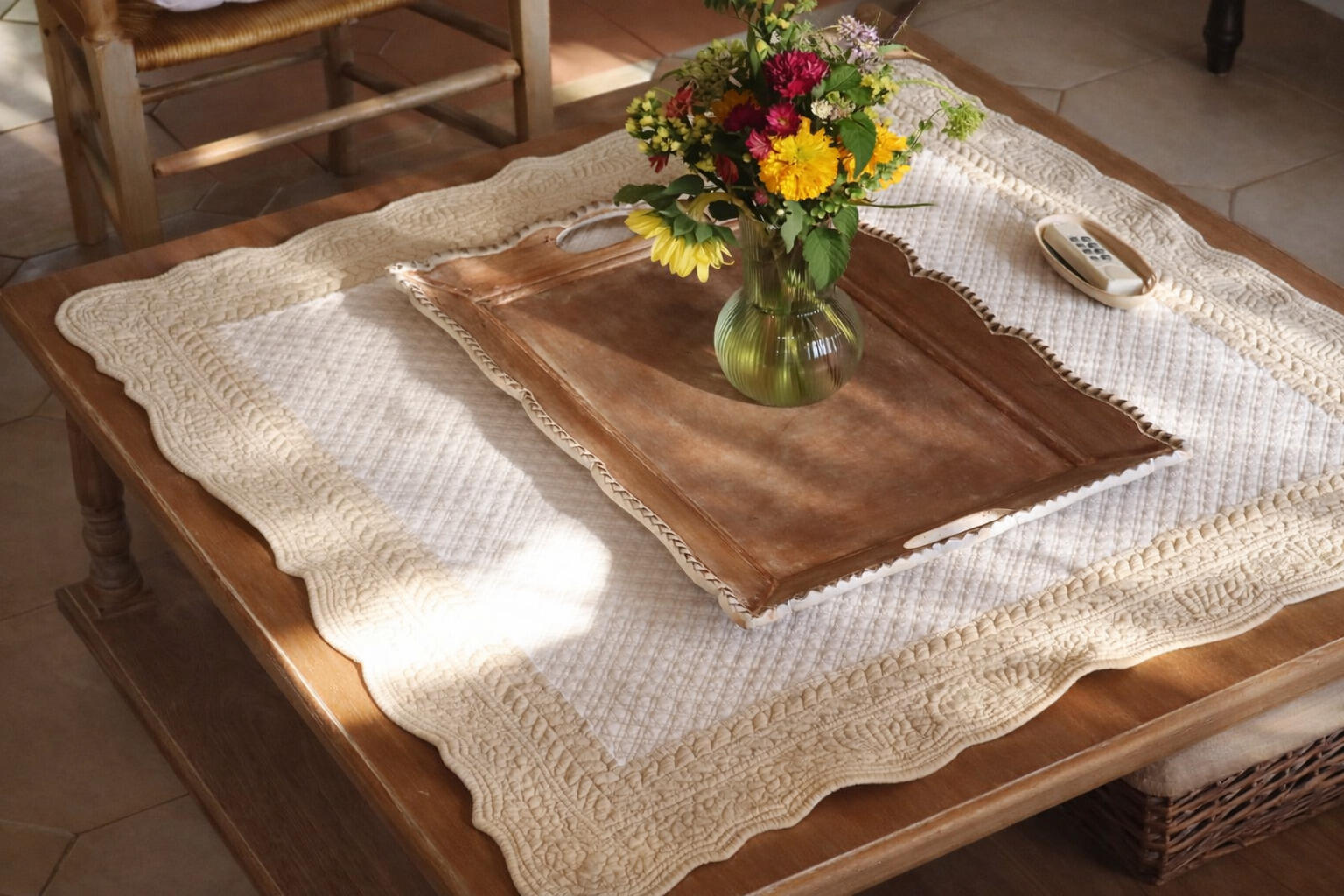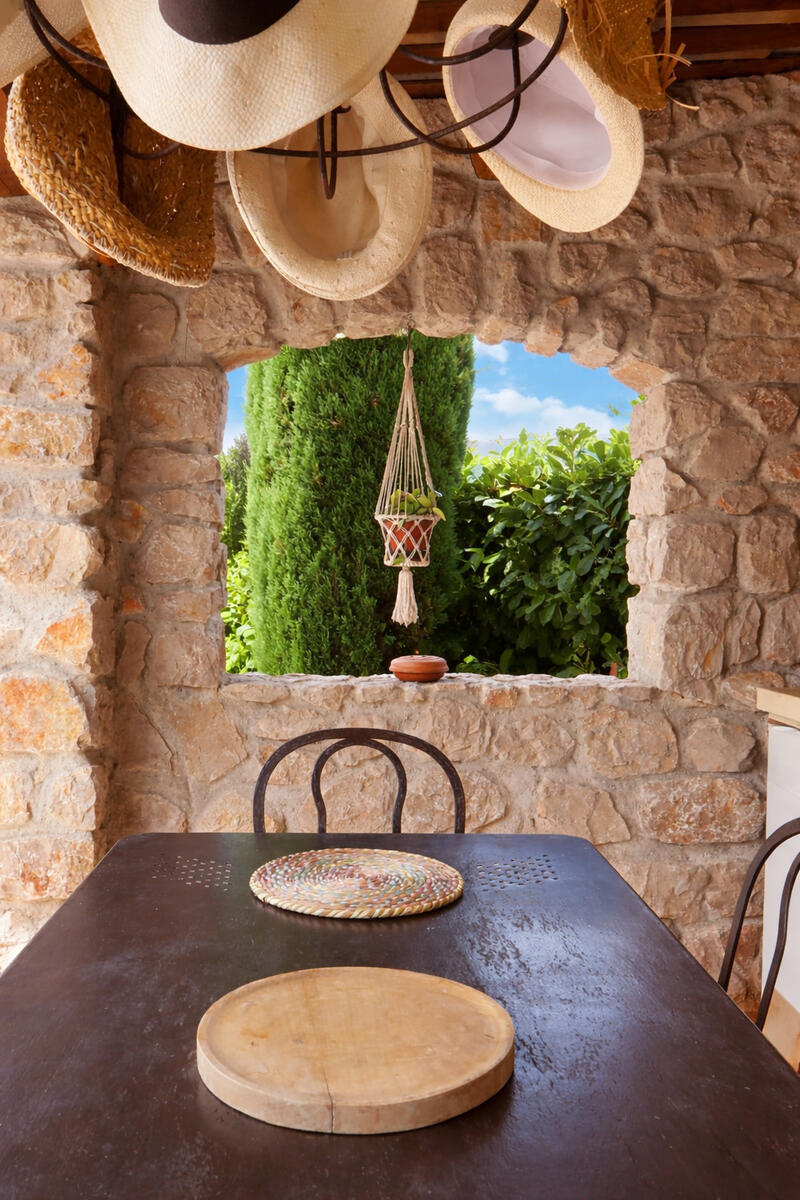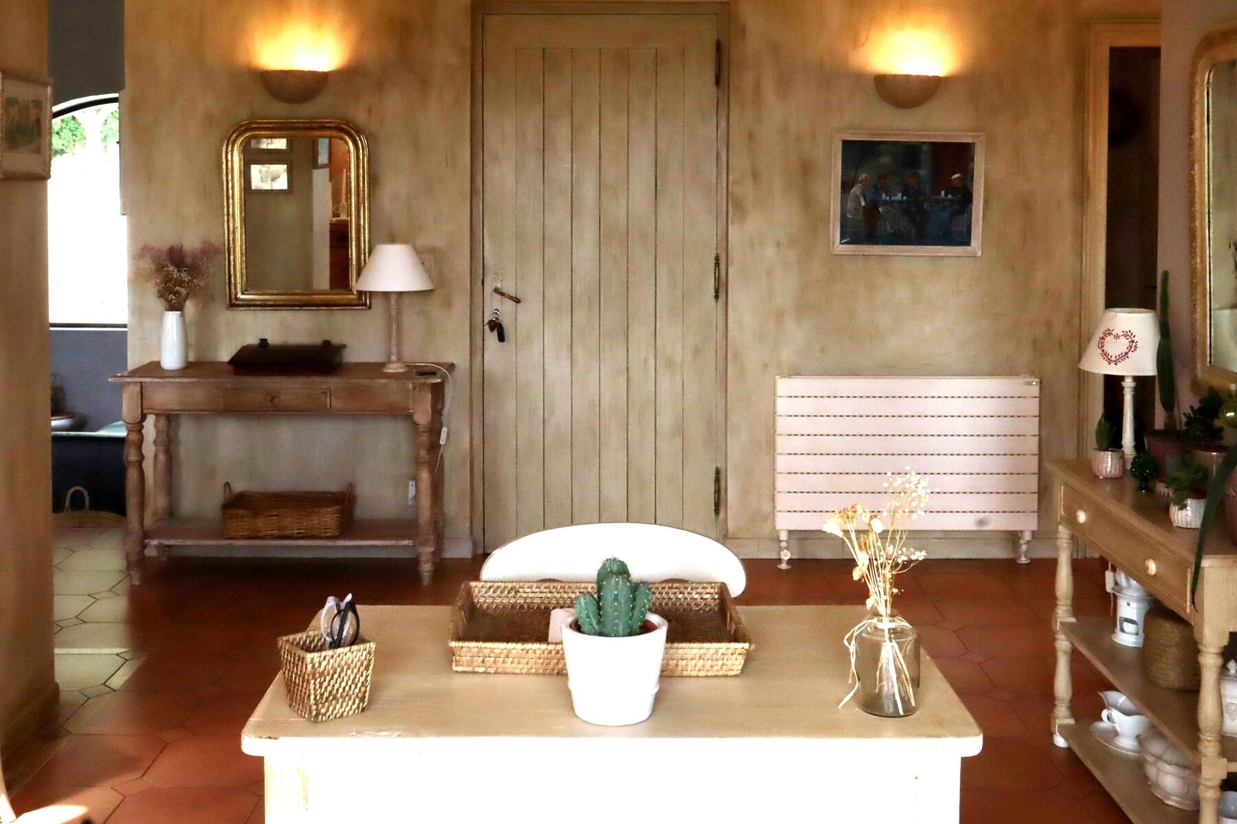 - Un lieu de vie extérieur couvert, bordé d'oliviers.