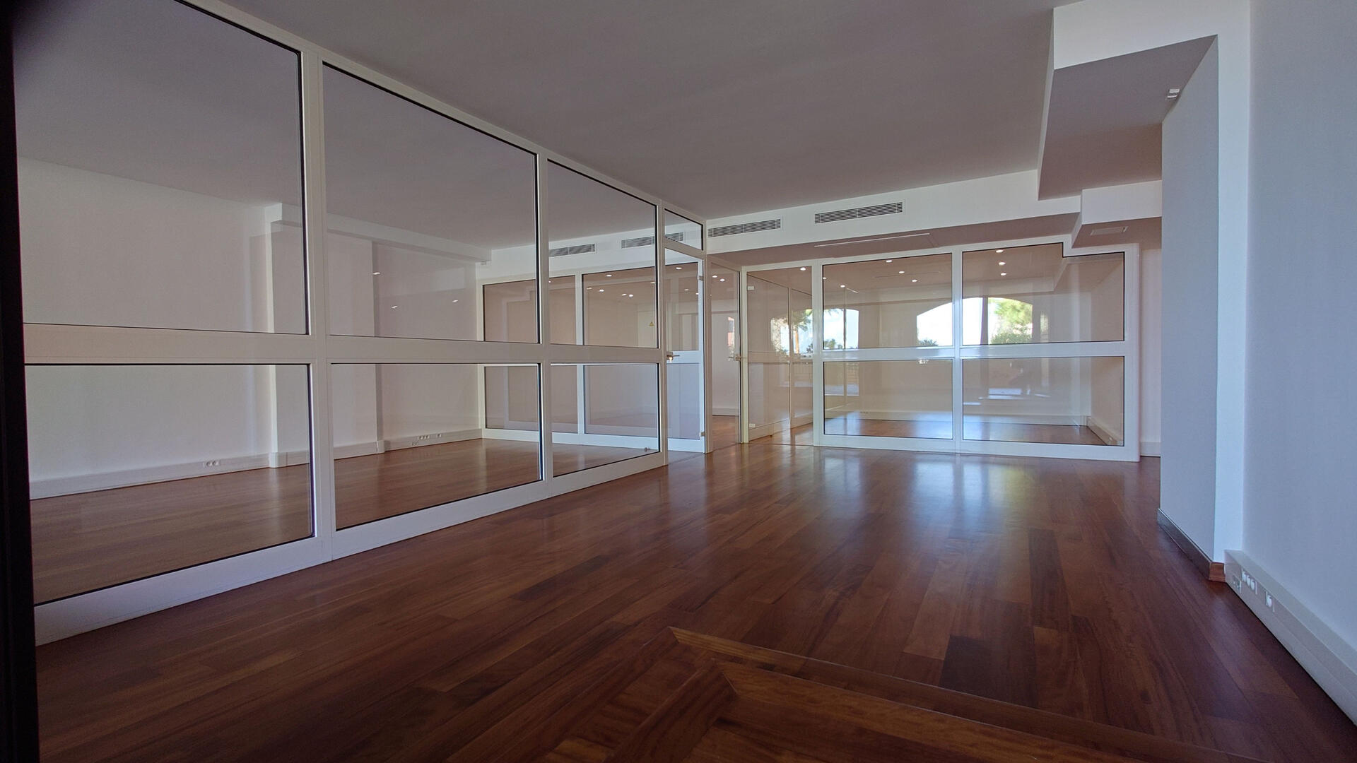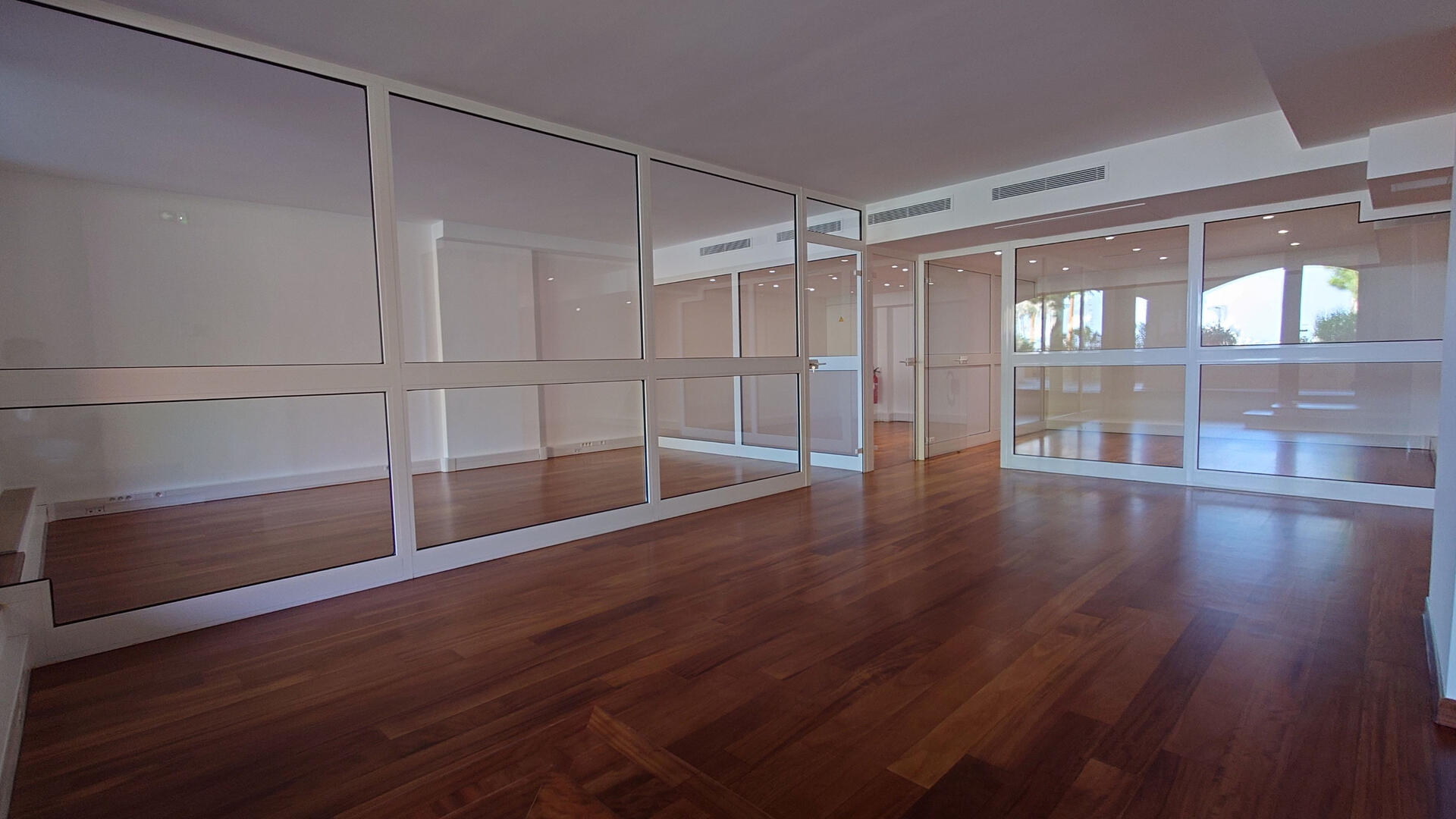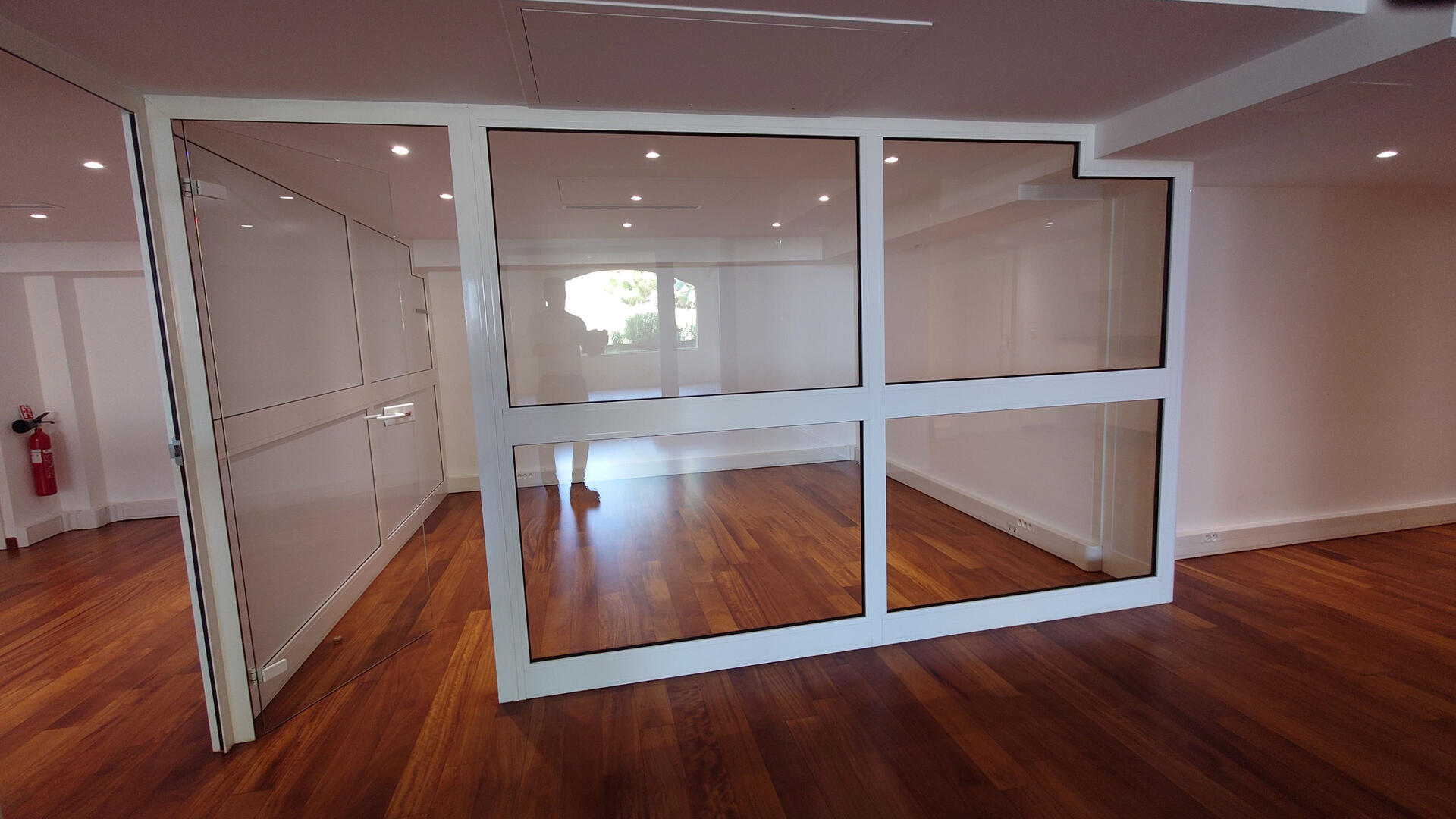 Le bureau climatisé dispose d’une pièce principale spacieuse de 94 m2 divisée par des baies vitrées en trois bureaux et une cuisine/salon séparé.
