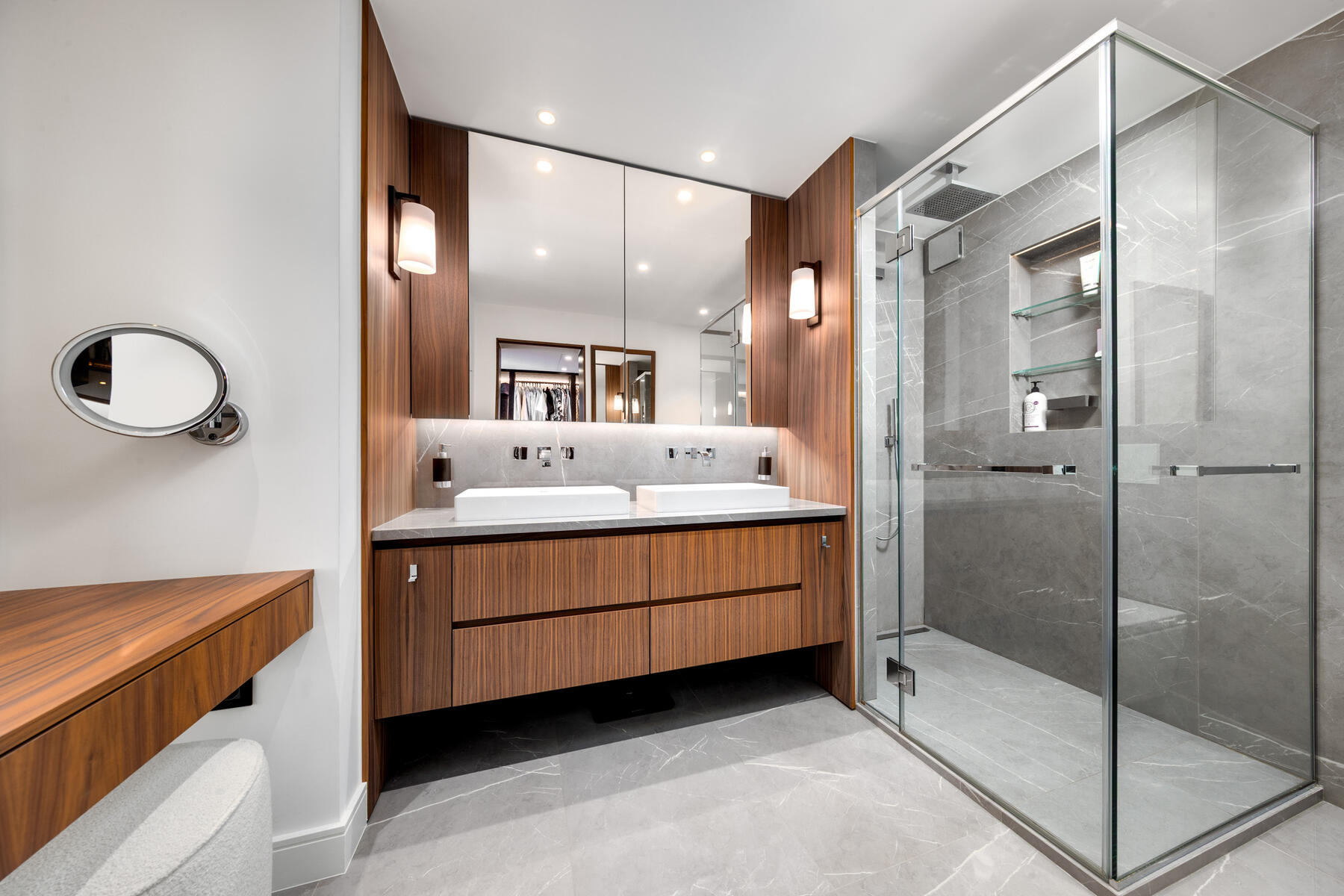 La chambre de maitre profite aussi de cette vue exceptionnelle. La suite se compose d’un mobilier sur mesure, d’une télévision avec barre de son Sonos et d’un dressing indépendant offrant de nombreux rangements. La salle de douche attenante, luxueuse et moderne, est équipée d’un chauffage au sol, de doubles lavabos, d’une grande douche à l’italienne et un WC à la japonaise haute technologie.