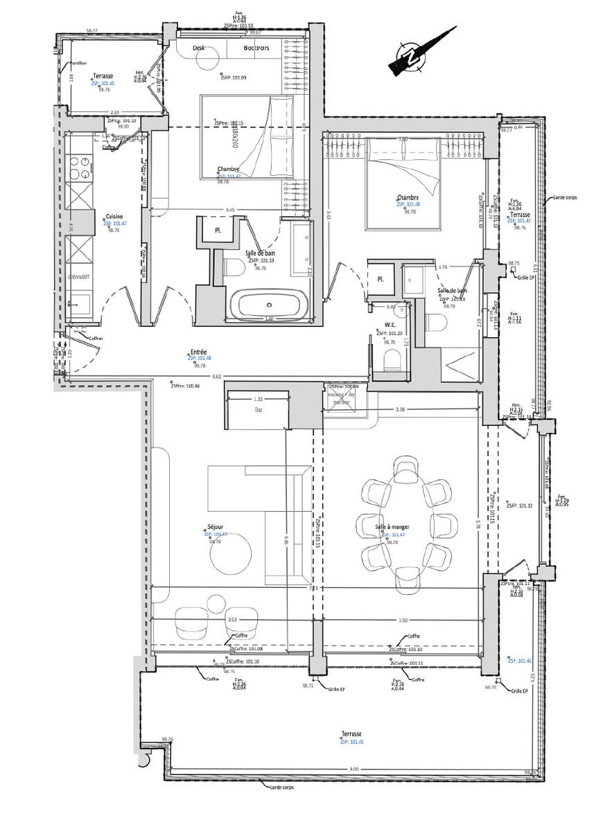 d’une entrée, d’un séjour lumineux ouvrant sur une grande terrasse de plus de 30 m² offrant une vue imprenable sur la mer et le Casino, d’une cuisine aménagée et équipée, ainsi que de deux chambres en suite avec leurs salles de bains et un WC invité.