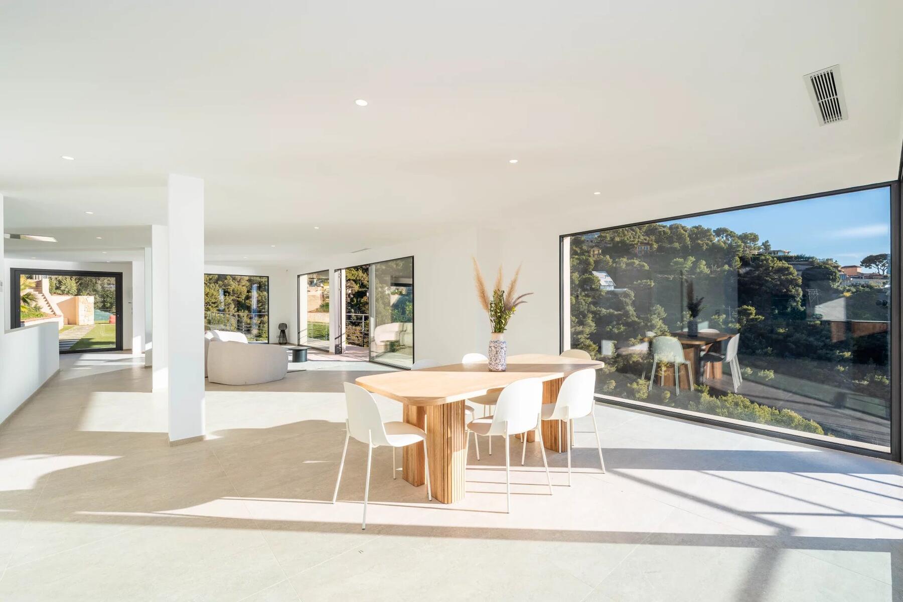Au rez-de-chaussée : une élégante entrée, un vaste et lumineux salon ouvrant sur le panorama, une cuisine moderne, des toilettes invités.