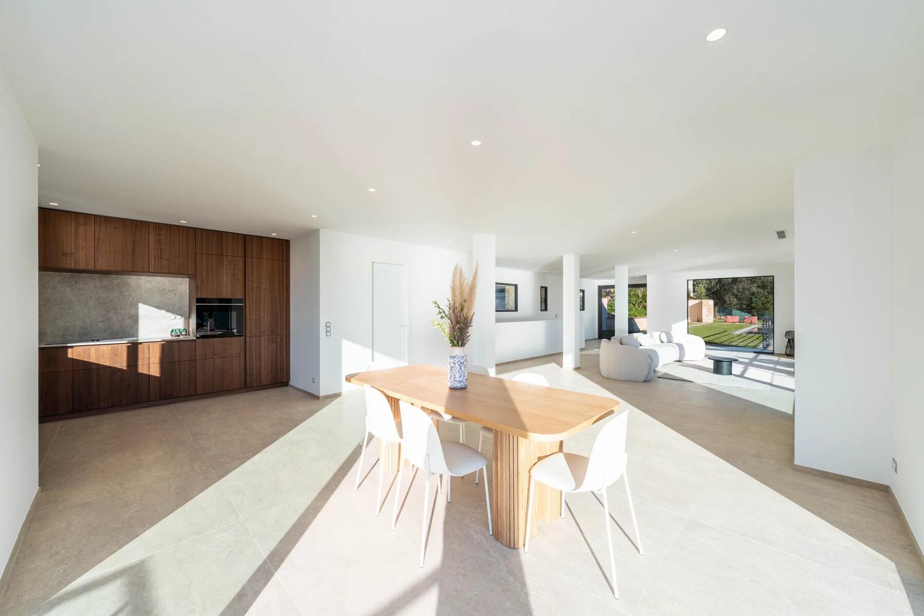 L’extérieur, véritable havre de paix, bénéficie d’un jardin arboré, d’un calme absolu et sans aucun vis-à-vis. Vous y découvrirez également un spectaculaire espace de détente composé de 200 m² de plage piscine entourant une piscine à débordement chauffée (Infinity pool), idéale pour profiter pleinement du soleil omniprésent tout au long de la journée.