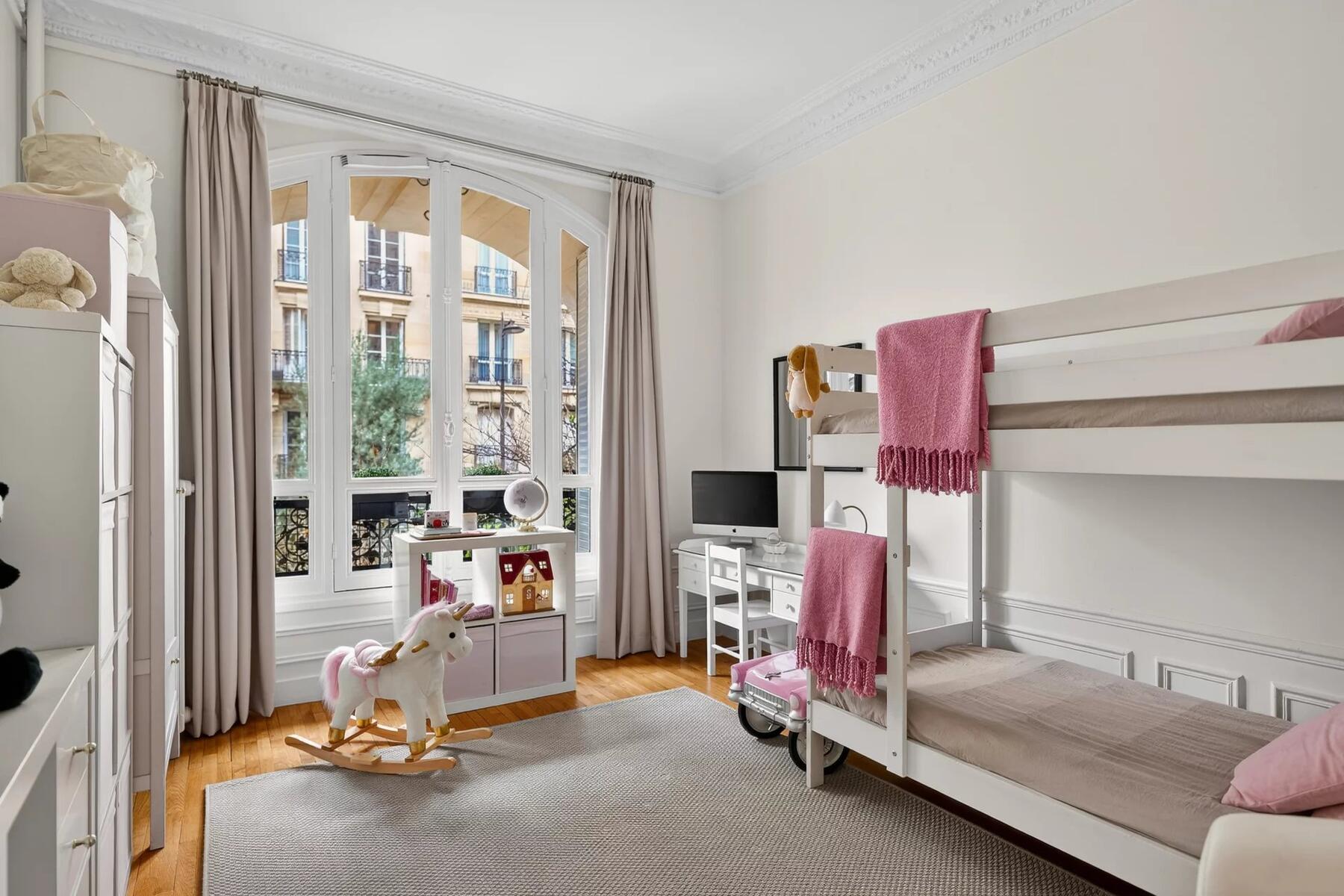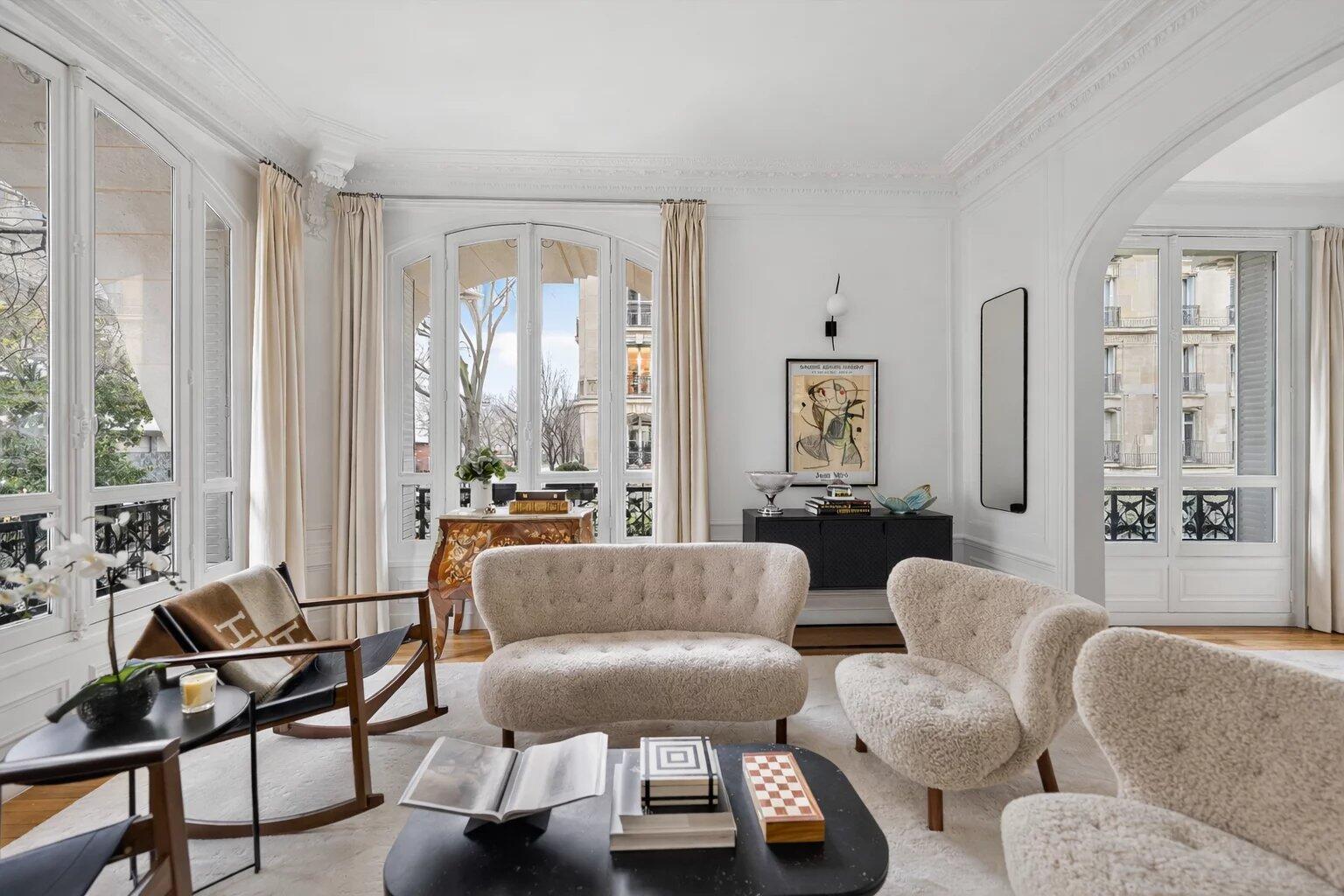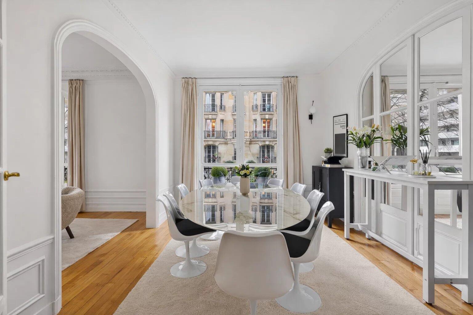 Les parquets d’origine, les cheminées et les volumes généreux confèrent à l’ensemble une atmosphère à la fois chaleureuse et raffinée.