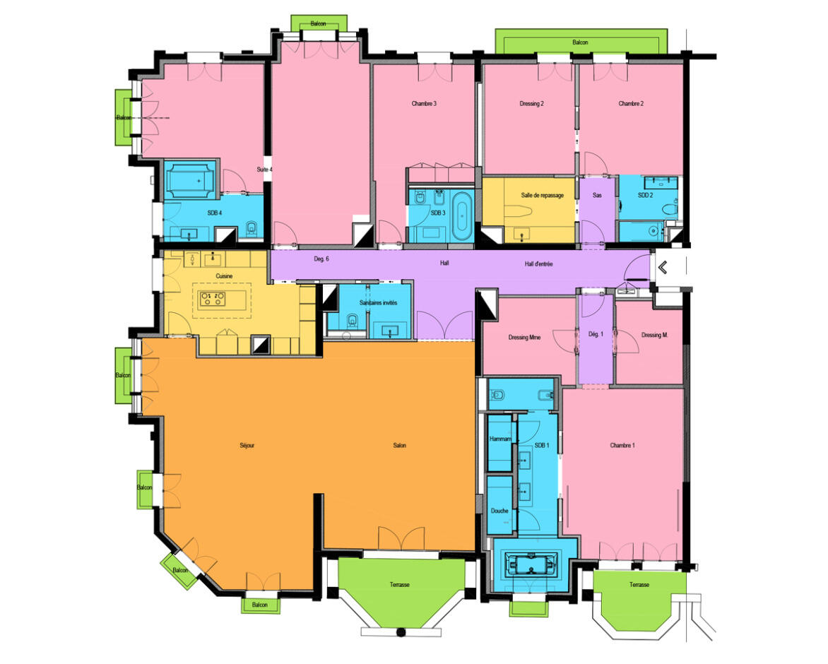 D’une superficie d’environ 414 m², dont près de 380 m² de surface intérieure, cet appartement propose de généreux volumes et une distribution idéale pour une clientèle exigeante. Il se compose d’une élégante suite de maître avec vue mer, de deux suites supplémentaires ainsi que d’une quatrième chambre, offrant un cadre de vie raffiné et confortable.