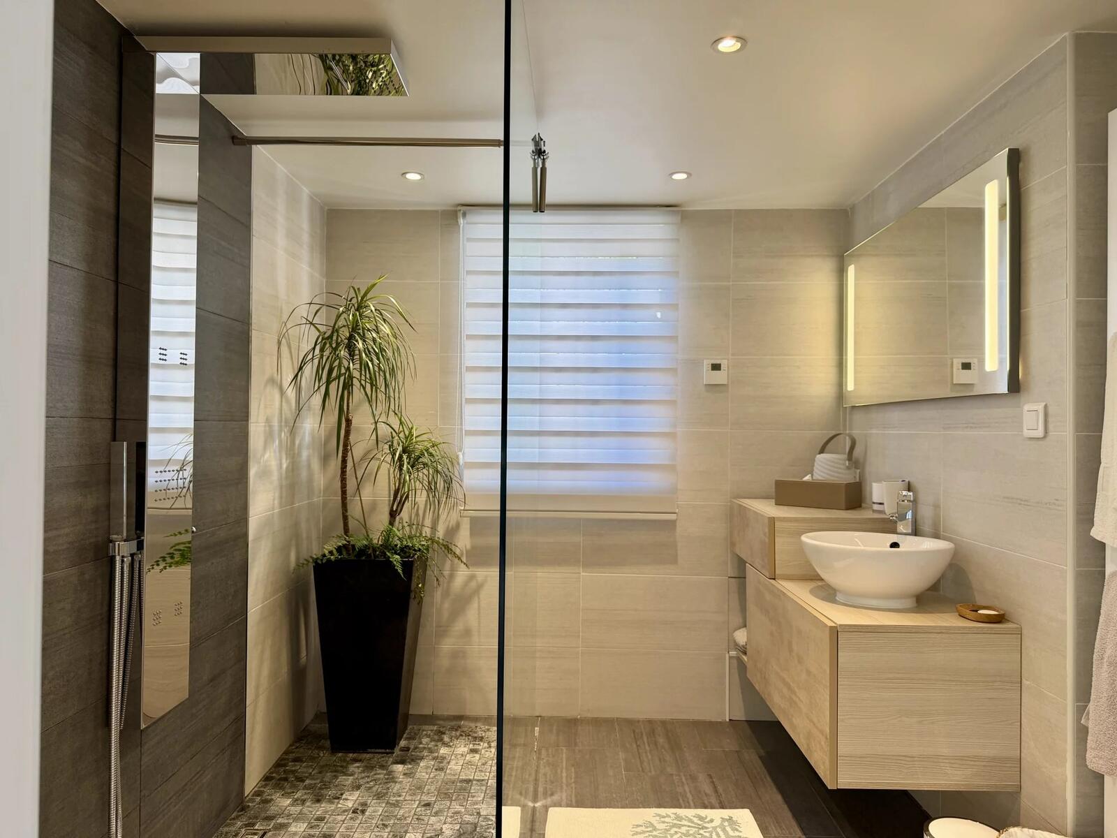 Le rez-de-chaussée accueille un spacieux séjour d’environ 55 m², une grande cuisine ouverte, un toilette invités ainsi qu’une chambre avec sa salle de douche privative.